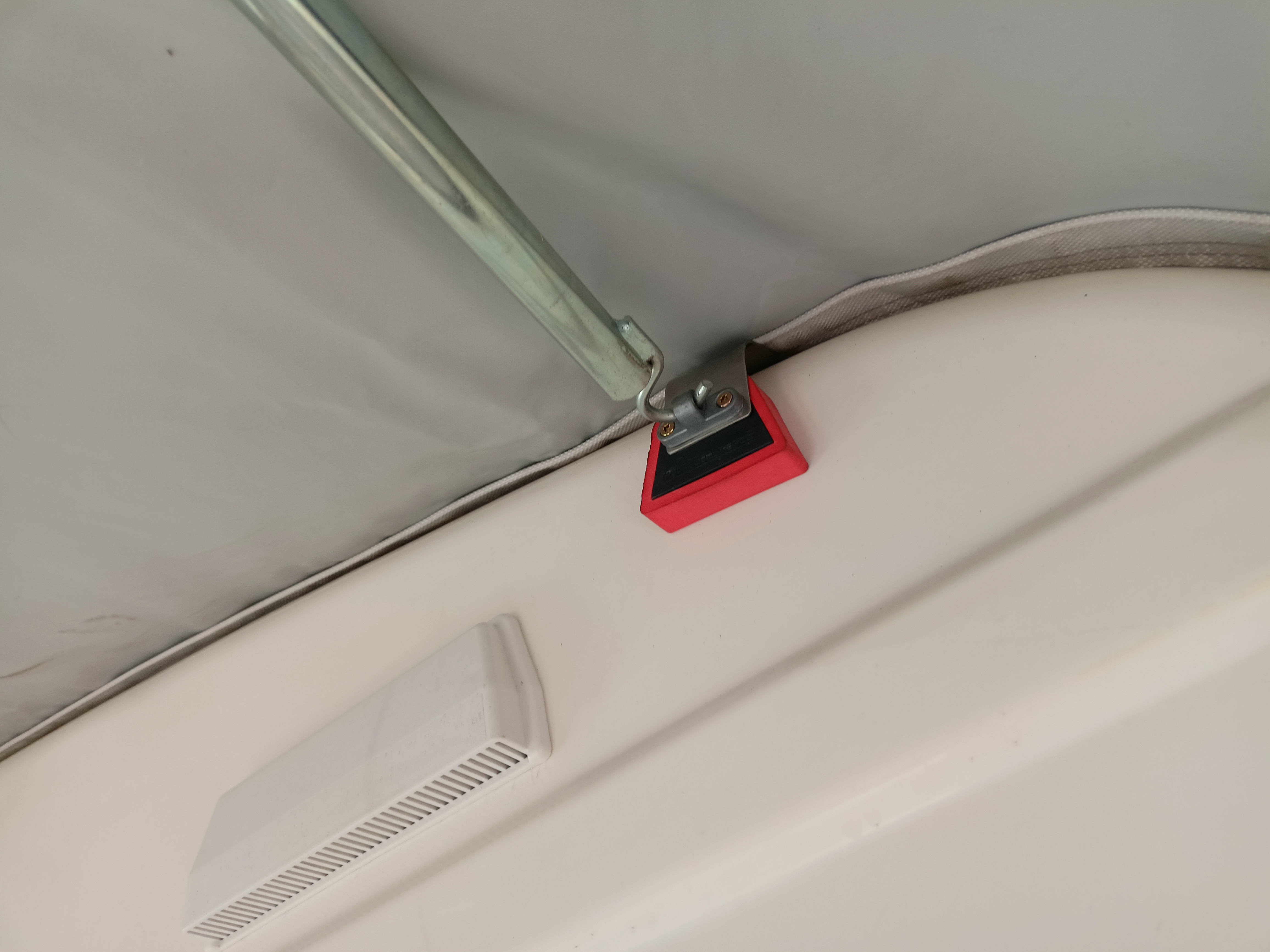 To daje tyle że nie trzeba wiercić poszycia przyczepy przyczepiasz uchwyt do podwójnej kedry opierasz o budę i na końcu rurek jest haczyk który wchodzi w otwór w tym uchwycie i dach leży na tych rurkach którymi go uciągasz  .