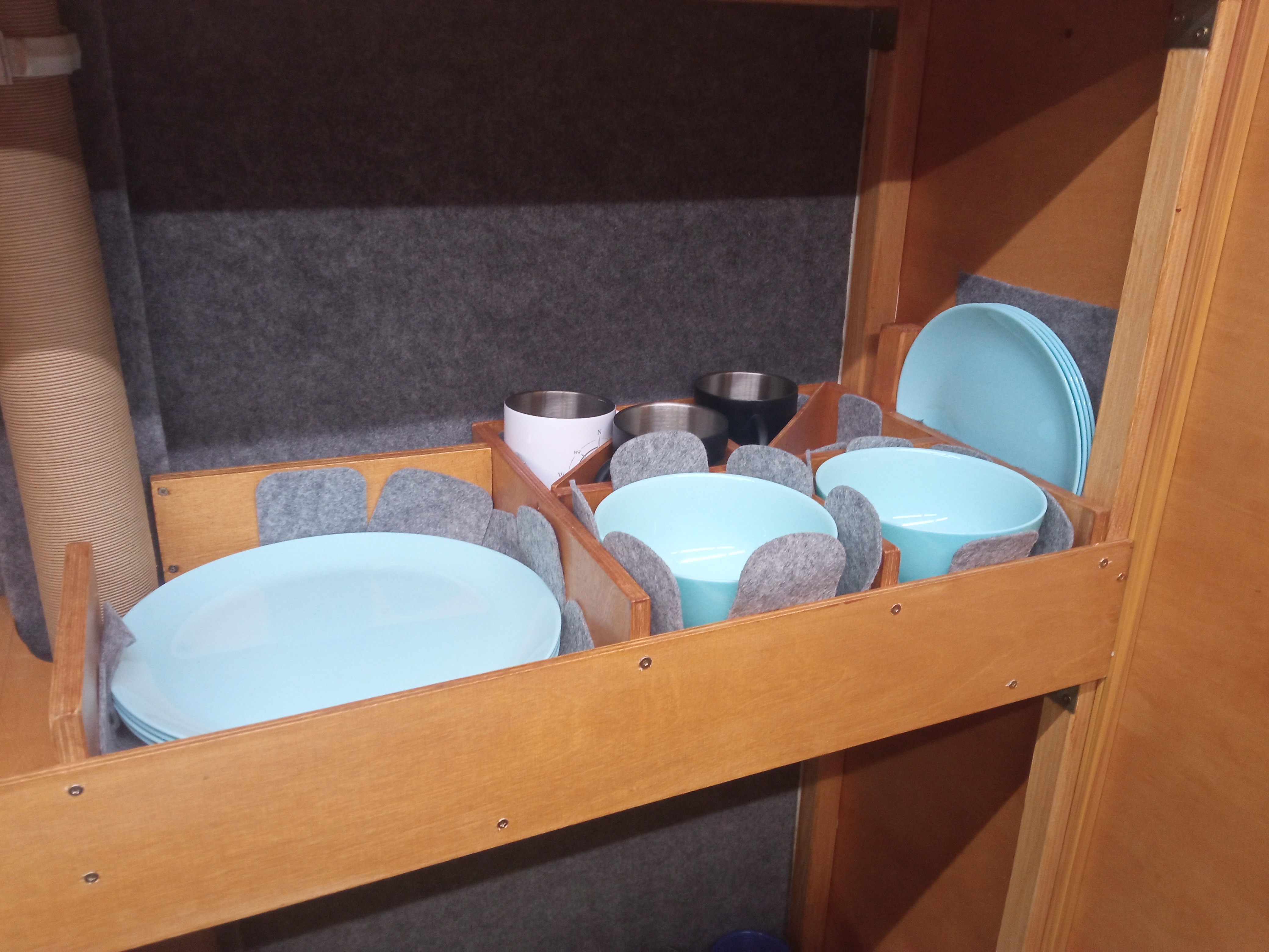 Dzisiaj skończyliśmy rzeźbić organizer z przegórkami na naczynia - mieści 4 talerzyki małe, 2 miski, 4 talerze płaskie, oraz 4 kubki. Przegródki ze sklejki montowane na półce nad Trumą. Organizer będzie rozbudowywany. Dopasowany jest do wymiarów zakupionego kompletu naczyń. Przegródki wyłożone są filcowymi przekładkami, aby zminimalizować obijanie się naczyń. Celowo nie wklejaliśmy żadnych filców na stałe, aby ułatwić sobie czyszczenie przegródek.