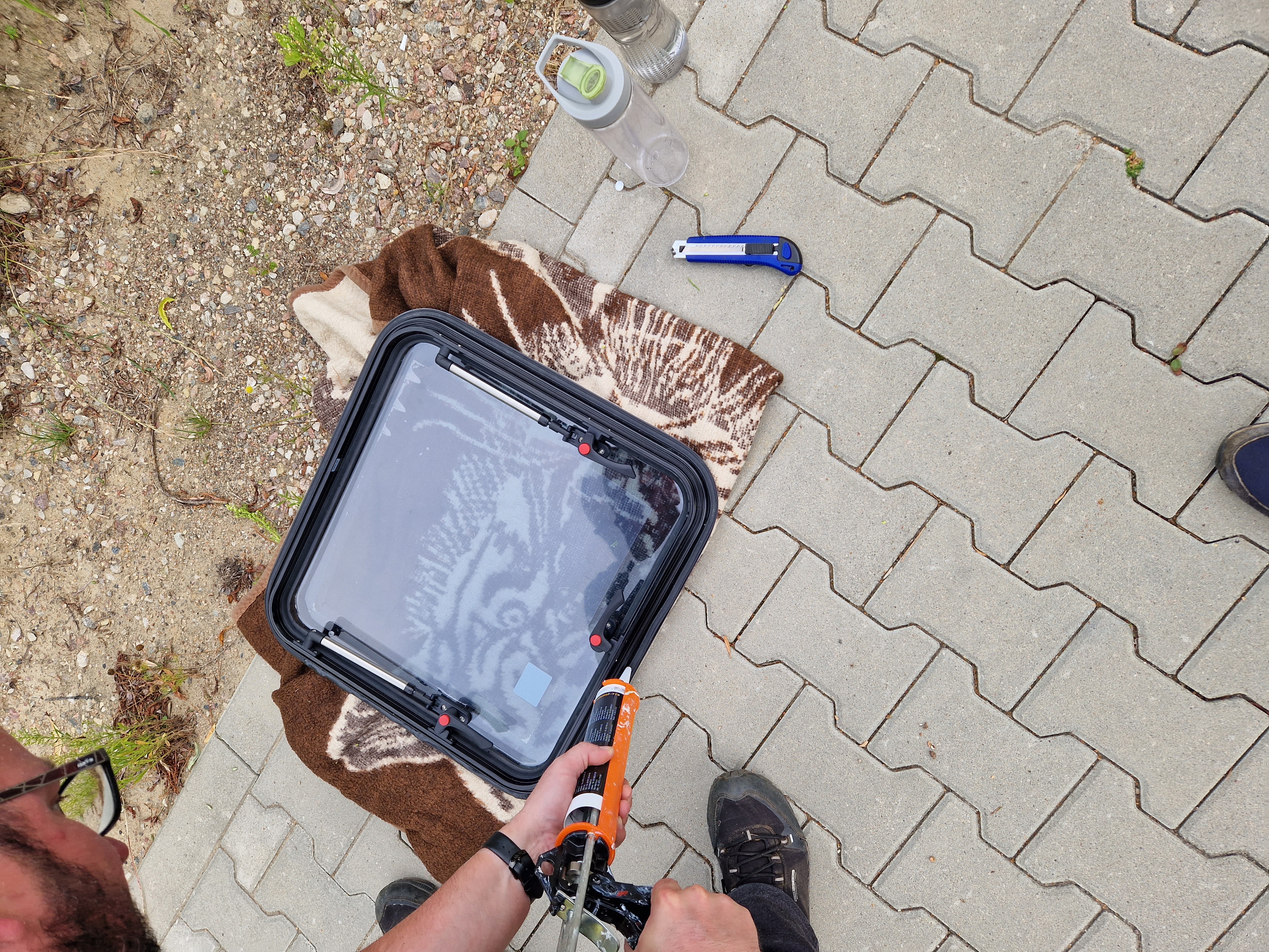 Zakupione okno posiada, w przeciwieństwie do Dometiców, uszczelkę gumową, więc nie ma potrzeby użycia uszczelniacza. Mimo to, po rozmowie ze sprzedającym (facet handluje tymi oknami i z tego co zrozumiałem, też majstruje kamperki) zdecydowałem się za jego radą użyć butylu. I tak miałem jakieś zapasy jeszcze z czasów kaczki, więc nie stanowiło to dla mnie dodatkowego kosztu, a mimo znacznego upłynięcia terminu ważności (właściwie to best before), spokojnie można takiego butylu użyć.