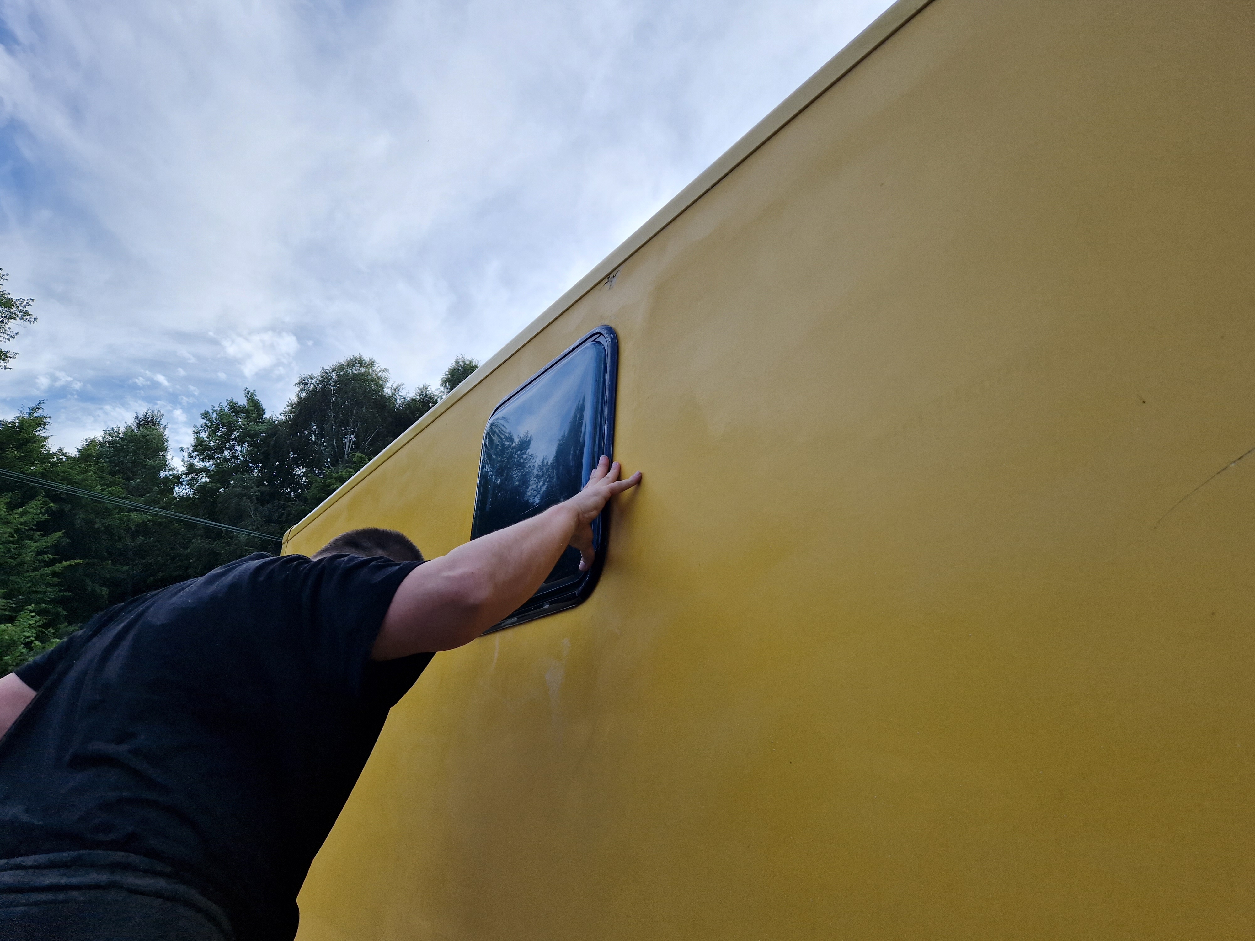 Otwór wyszedł bardzo ładnie.Zakupione okno posiada, w przeciwieństwie do Dometiców, uszczelkę gumową, więc nie ma potrzeby użycia uszczelniacza. Mimo to, po rozmowie ze sprzedającym (facet handluje tymi oknami i z tego co zrozumiałem, też majstruje kamperki) zdecydowałem się za jego radą użyć butylu. I tak miałem jakieś zapasy jeszcze z czasów kaczki, więc nie stanowiło to dla mnie dodatkowego kosztu, a mimo znacznego upłynięcia terminu ważności (właściwie to best before), spokojnie można takiego butylu użyć.