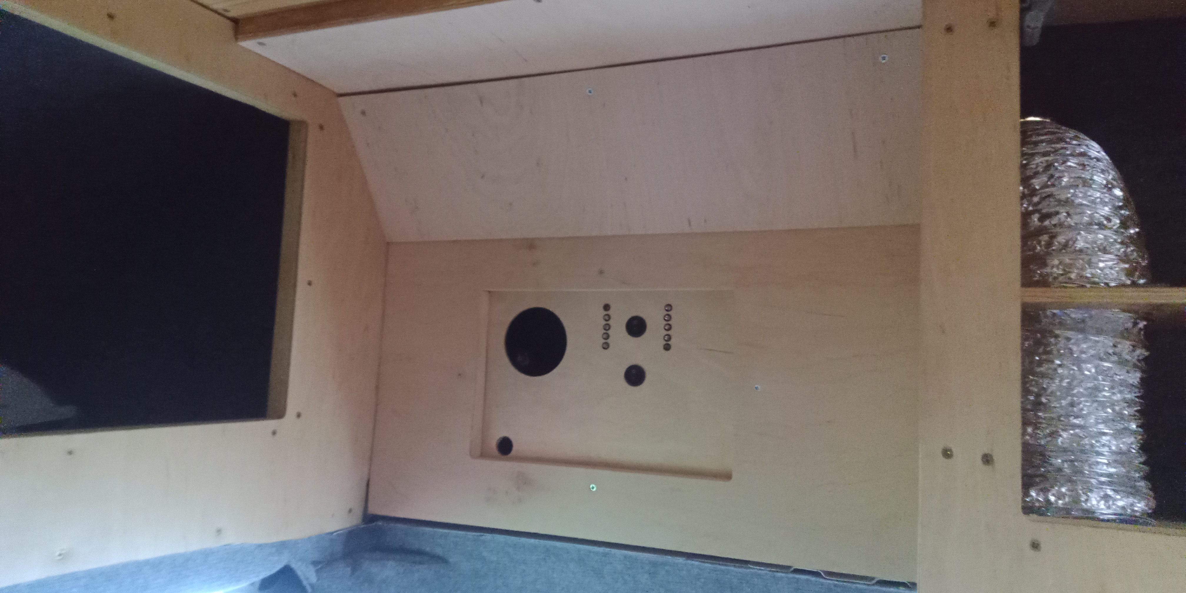 Na koniec, zabrałem się w końcu za wymyślenie jakiegoś kształtu dla "centrum sterowania" nad drzwiami wejściowymi. Będzie tam miejsce na sterownik MT50 do regulatora MPPT, sterownik od chinbasto, wskaźniki ilości wody czystej i szarej włączane jednym pstryczkiem, włącznik pompy wody i pewnie jeszcze jakieś coś
