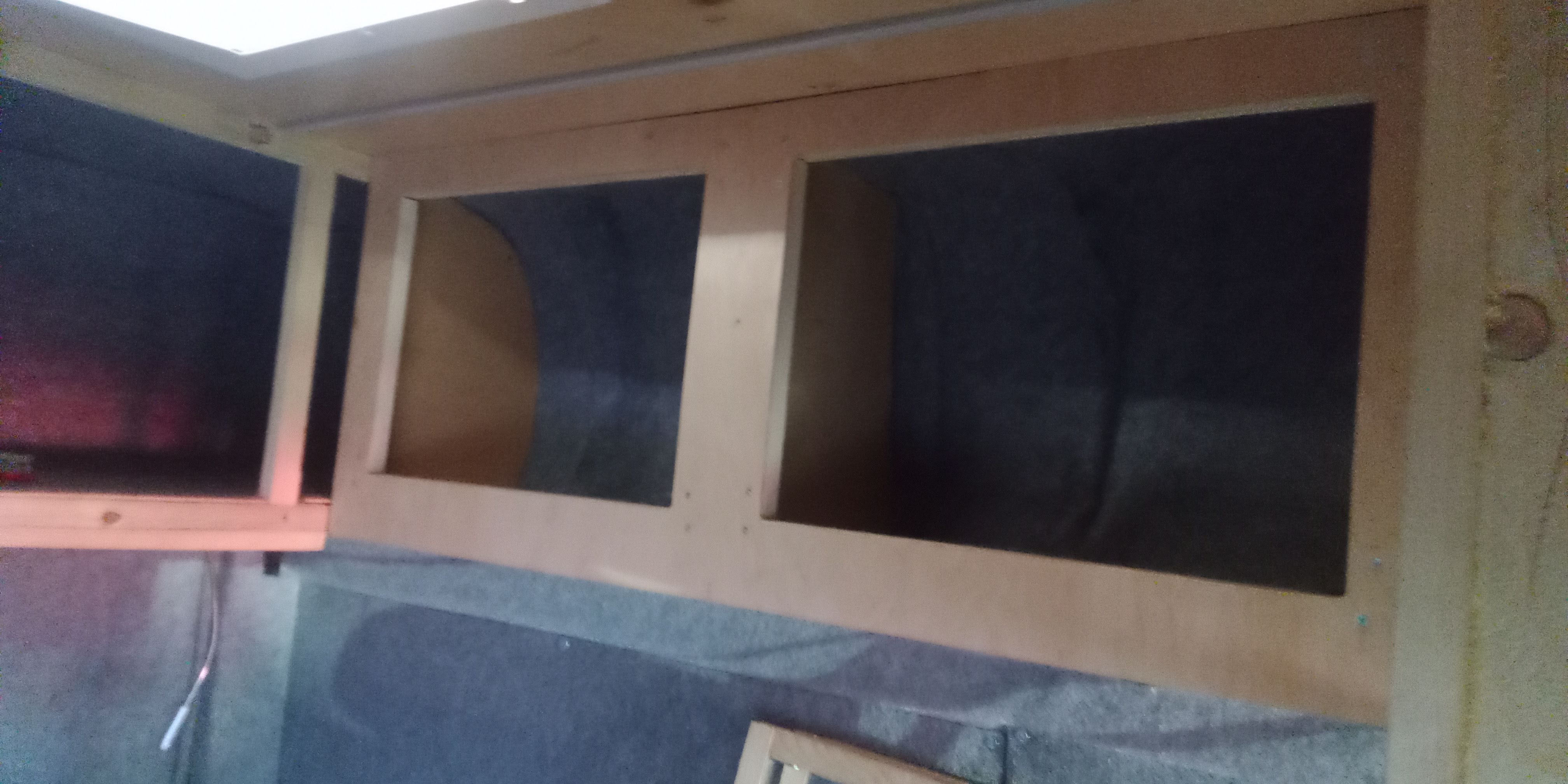 Wróciłem do stolarki i skończyłem ściankę tylną. Ze względu na kształt tyłu opla, ścianka jest przełamana w górnej części. Nad ścianką powstanie jeszcze półka, dostępna po otwarciu drzwi, na której znajdą swoje miejsce maszty do tarpa, najazdy, siekierka i tym podobny szpej.
