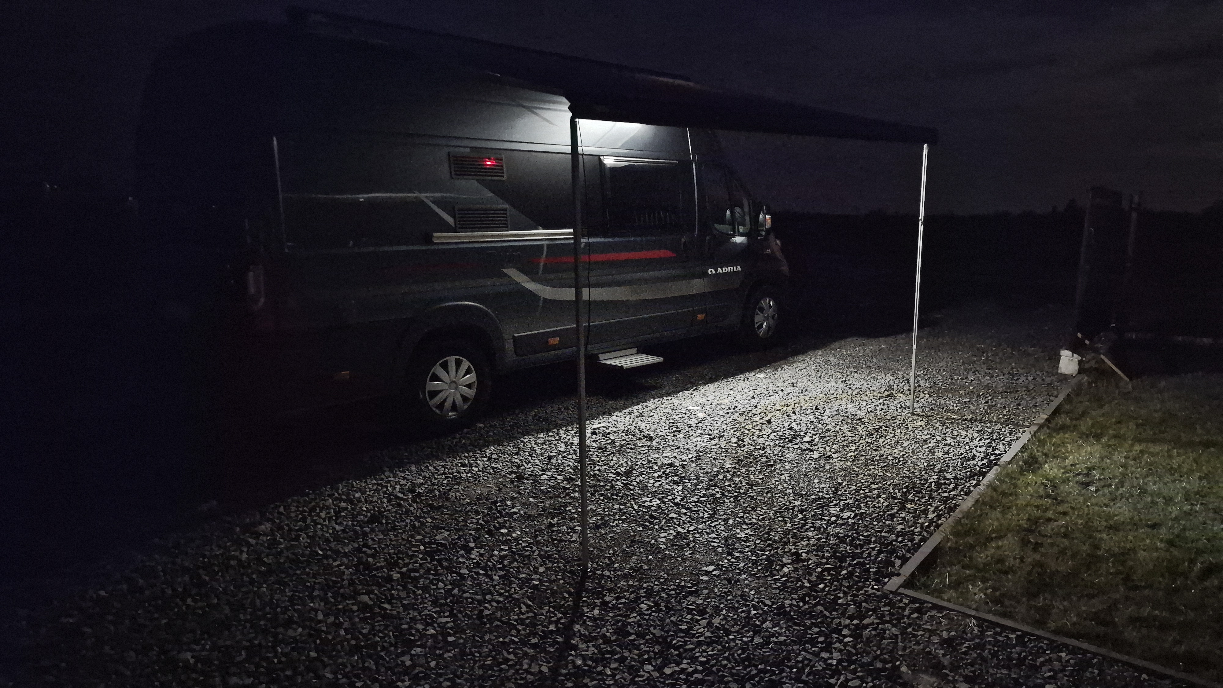 W związku z tym pod markizą dałem ledy przyklejone do ramion. Takie światło po pierwsze jest od góry, a nie od boku i do tego z dwóch stron. W lampce na ścianie budy/kampera zawsze mnie wkurzało to, że jak nie usiądziesz to i tak na coś będziesz sam sobie rzucać cień.