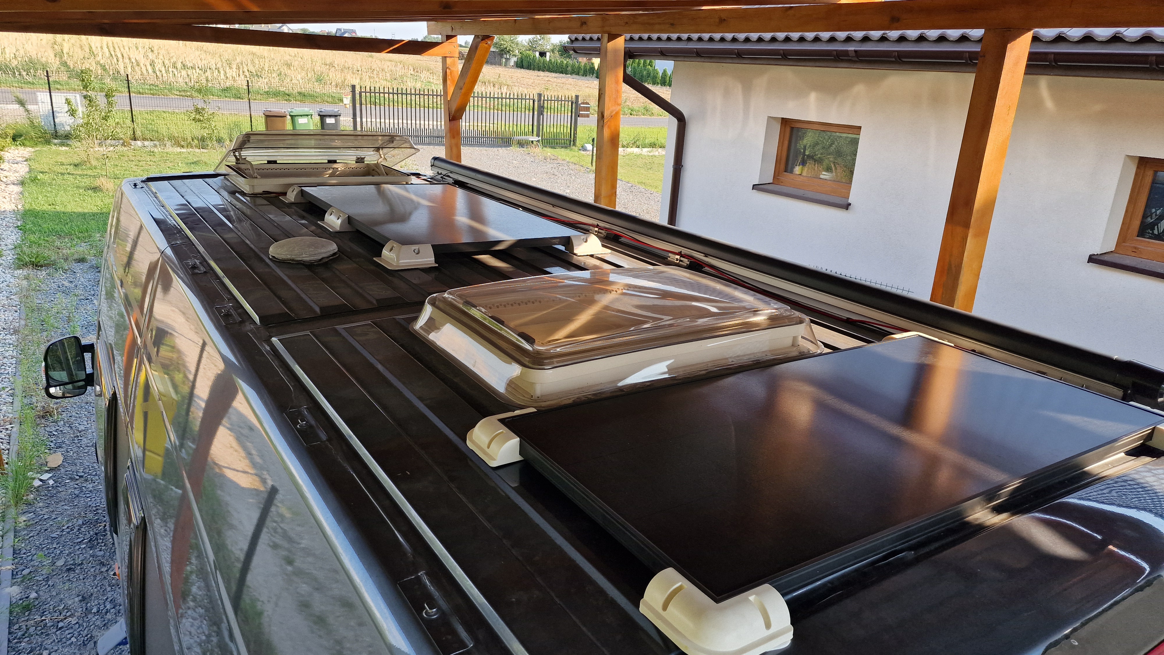 Urlop na Rumunii, więc na pewno lodówka nie będzie miała lekko i wciągnie dużo Ah. W związku z tym na dach wjechało dodatkowe 8 kg w postaci panela 130W. Lepiej byłoby 180W tak jak pierwszy panel, ale się nie zmieści. Połączone oczywiście szeregowo żeby MPPT miało gdzie rozwinąć skrzydła.