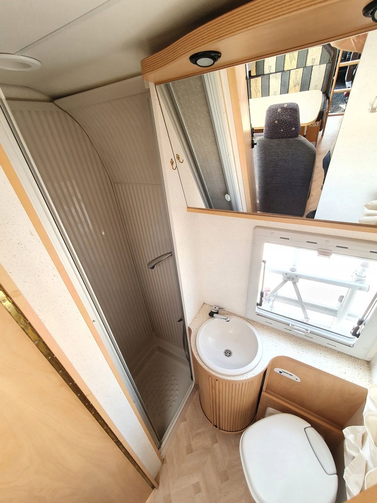 Zastanawiam się też nad łazienką, która okazała się chyba jeszcze ciaśniejsza niż w Knausie. W łazience jest szafka z okrągłą dość dużą umywalką i zastanawiam się czy nie wymienić jej na mniejszą, a szafkę wypłaszczyć do głębokości tego parapetu za kibelkiem.