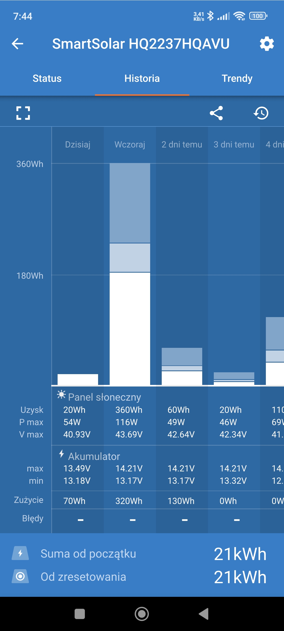 Niestety pomiar ten nie uwzględnia, jak już wspomniałem wcześniej, poboru prądu przez urządzenia w zabudowie i ładowania z alternatora w czasie jazdy więc obarczony jest pewnym błędem ale na pewno da jakieś rozeznanie w temacie, a biorąc pod uwagę tylko tak skromne dane z kilku godzin to jestem pełen nadziei że prądu na wakacjach nie braknie, chociaż z tyłu głowy mi się kołacze żeby może jeszcze 100W na dach dołożyć, bo Victron może obsłużyć do do 75V
