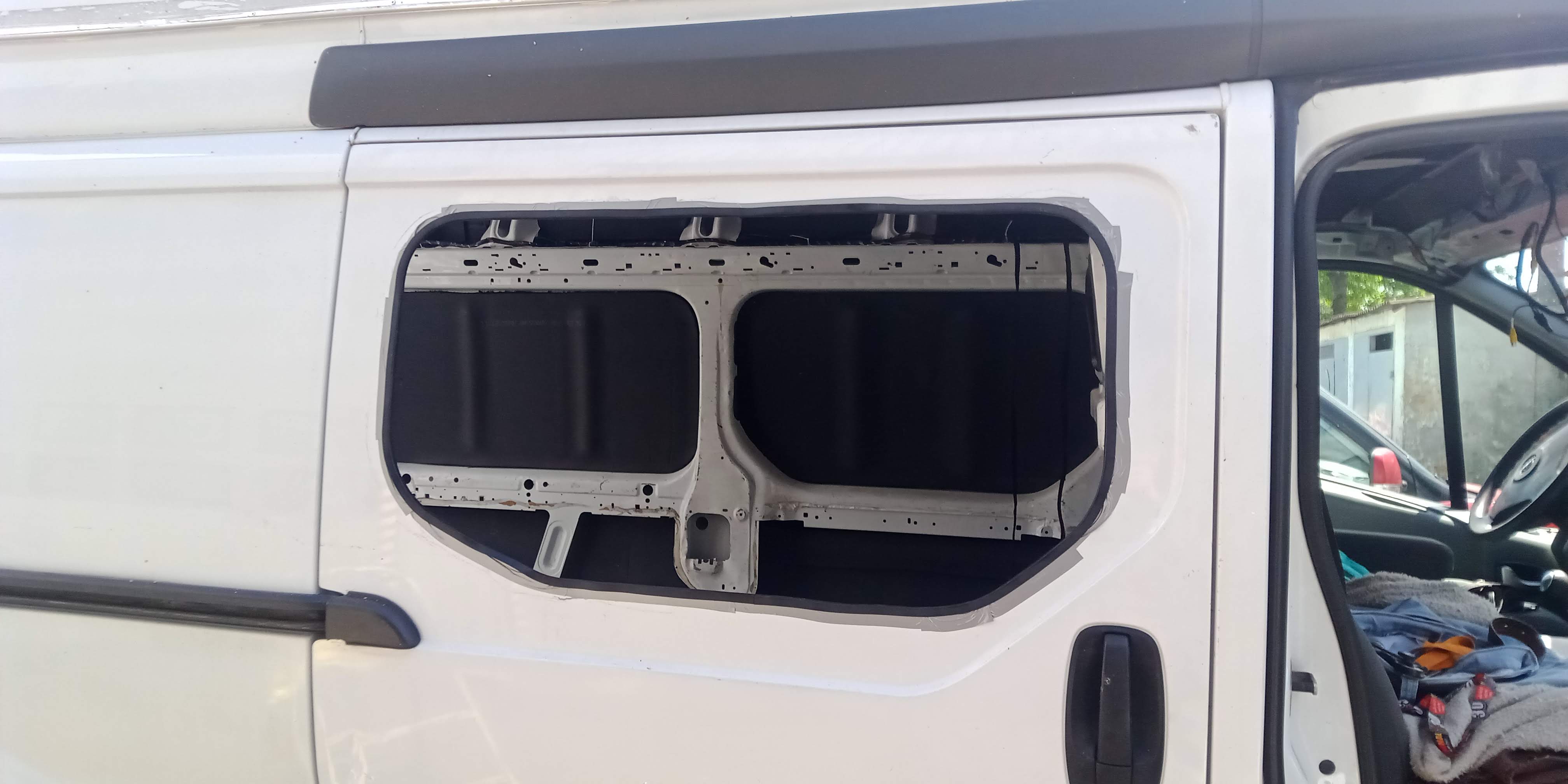 Dzisiaj, korzystając z pogody postanowiliśmy zamontować okno w drzwiach przesuwnych. Okno kupione na jesieni, można powiedzieć, że nabrało już mocy urzędowej, więc nadszedł na nie czas. Ponieważ nigdy tego wcześniej jeszcze nie robiłem to muszę się przyznać, że miałem przed tą robotą pełne portki. Naoglądałem się sporo filmów na temat wklejania takich szyb, więc jako tako, wiedziałem co trzeba robić. Kupiłem zestaw do montażu szyb samochodowych i teoretycznie byłem przygotowany, ale miałem dwie obawy. Po pierwsze, czy wystarczy primera do posmarowania blachy i szyby, bo ta miniaturowa buteleczka nie wzbudzała mojego zaufania. Po drugie, czy wystarczy kleju. Dokupiłem więc drugą buteleczkę tego gruntu i kartusz kleju do szyb. Okazało się, że moje obawy były bezpodstawne. Mikrobutelka wystarcza na naprawdę dużą powierzchnię i dało się zagruntować i szybę i karoserię. Kleju w jednym kartuszu jest aż nadto do wklejenia takiej szyby. Po kolei wyglądało to tak: