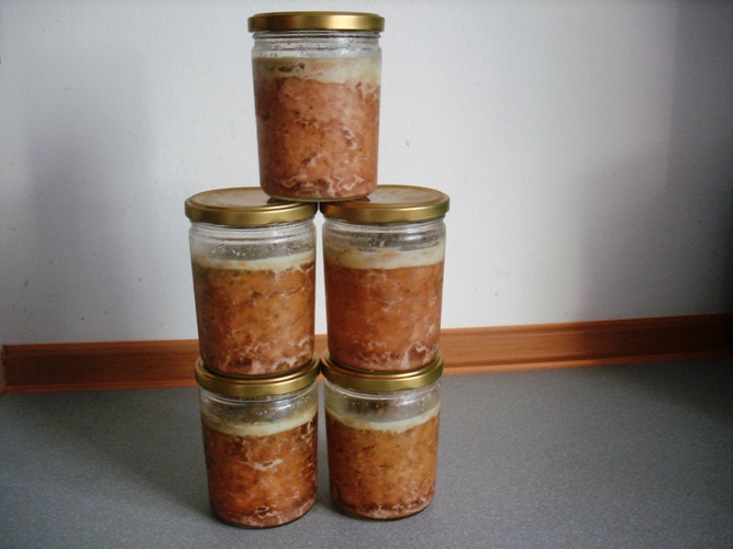 Wędzę szynki, balerony, ryby, zdarzyło mi się wędzić ser. W ulubionych przetworów to kapusta i ogórki kiszone, cukinia w curry, papryka konserwowa, ogórki konserwowe, w musztardzie i z chilli. Co do wyrobów wędliniarskich to robię też słoikową bardzo prostą i bardzo smaczną. Przepis poniżej. Zdarzało mi się również, bo gdzieś mam robić mielonki w szynkowarze.