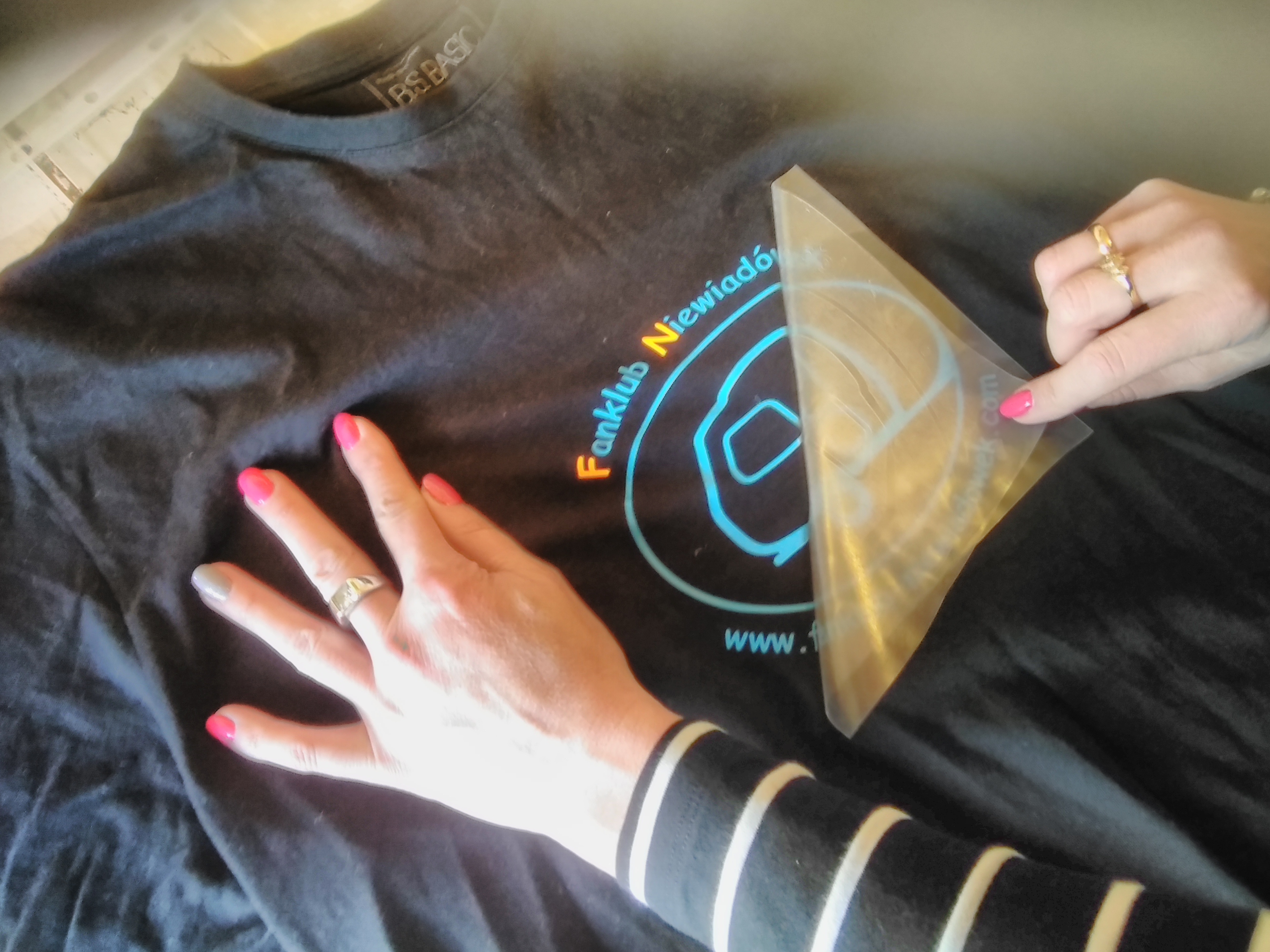 Miejsce wprasowania na koszulce ułóż na równej, twardej powierzchni. Przeprasuj wstępnie koszulkę. Ustaw naprasowankę równo w wybranym miejscu. Żelazko ustaw na max, ale para wyłączona. Około 2-3 minut równomiernie wprasuj przez pergamin mocno dociskając. Następnie odczekaj aż naprasowanka wystygnie. Teraz możesz delikatnie i powoli ściągnąć folię transferową. Naprasowanka gotowa.