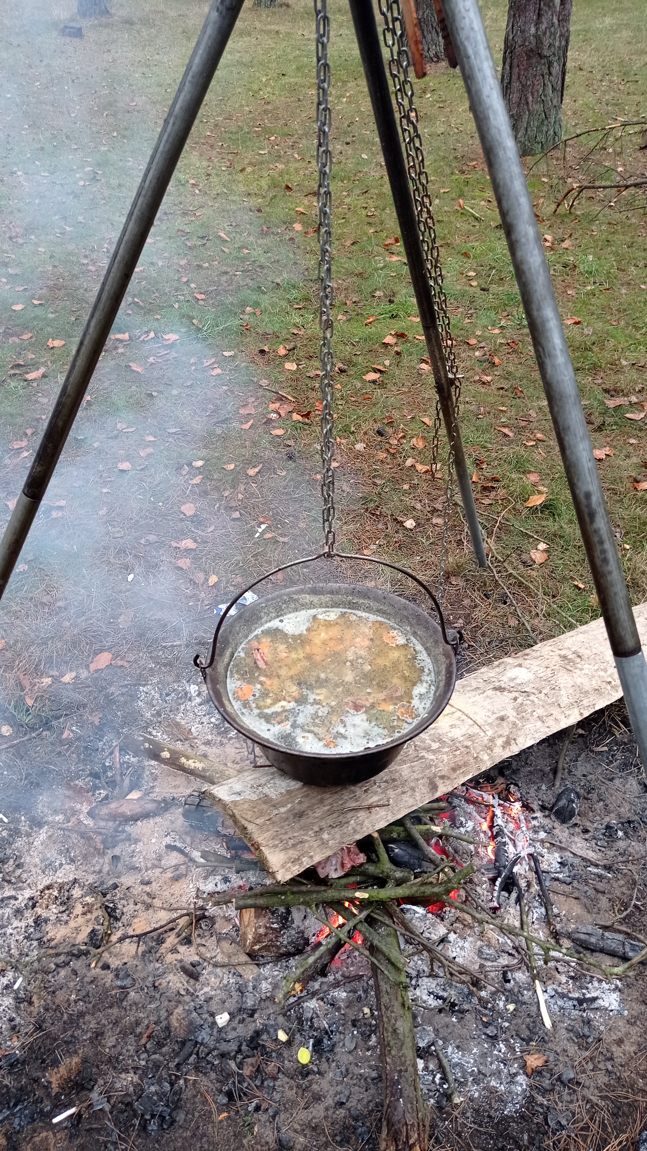 Kocioł nad ognisko mam jakbyś chciał gotować zupę dla wszystkich. Duży, chyba 13 litrów. Mogę zabrać, żaden problem.