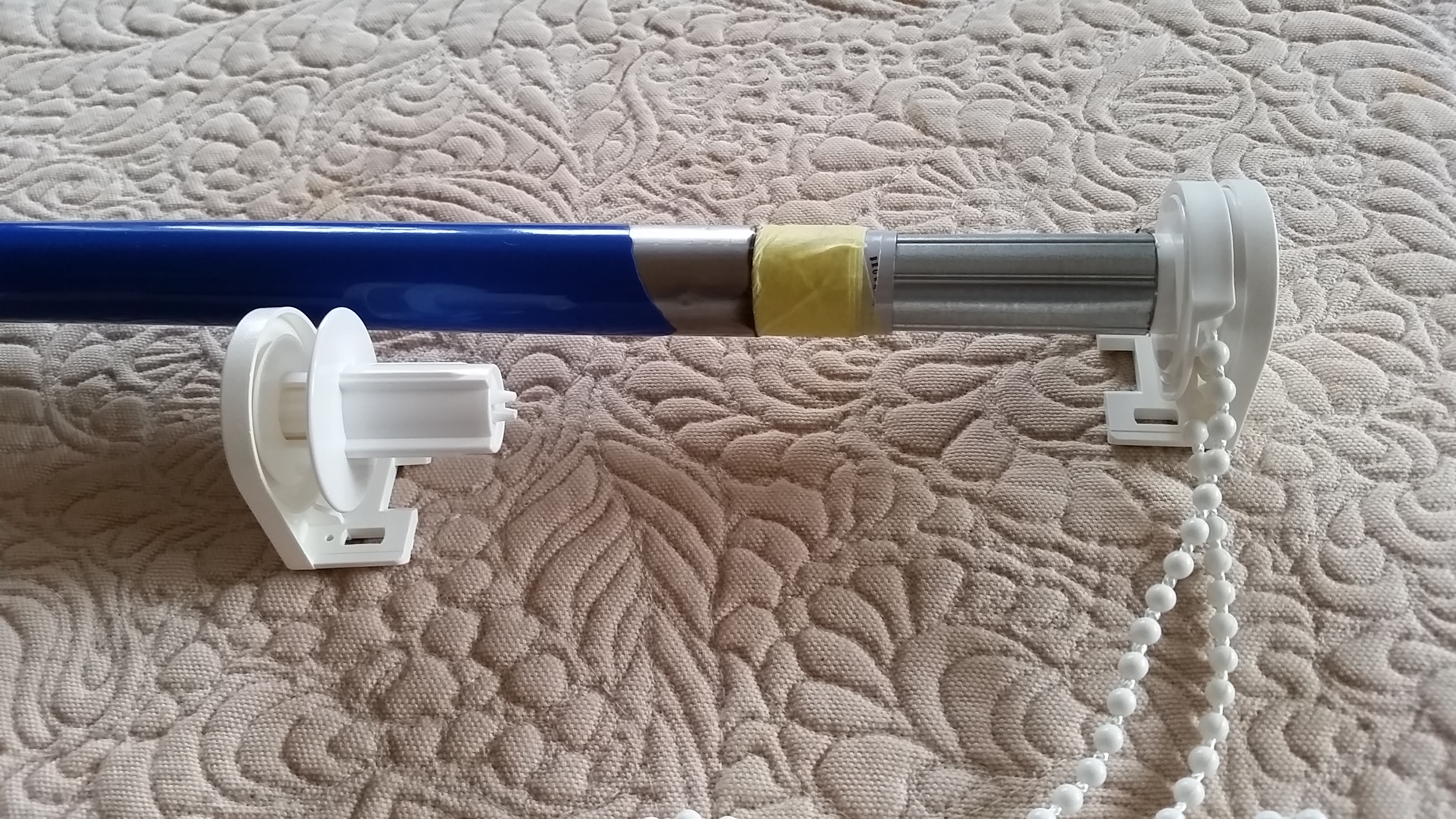 Postanowiłem zamontować rolety w oknach (tył, przód). Cena rolet w zakładzie produkcji rolet (okno 120cm x 60cm) szybko przekierowała mnie do marketu. Kupiłem rolety 140cm x 75 cm z myślą ich modernizacji dostosowującej je do okna w cepce. Sprawa prosta – zmienić sposób mocowania tkaniny (długość w układzie poziomym). Wymaga wykonanie dodatkowych zmian oryginału. Potrzebna dłuższa rurka do nawijania tkaniny. Zastosowałem metalowy kij do mopa. Do mocowania mechanizmów przewijania i mocowania zastosowałem kawałki oryginalnej rurki. I tu uwaga – potrzebna są… cztery piwa a dokładnie blacha z puszek. Sposób uzyskania takowej – sprawa wymagająca indywidualnego podejścia. Wykorzystałem blachę z puszek do powiększenia średnicy oryginalnej rurki celem dopasowania do wciśnięcia jej do końców kija od mopa. Może to brzmi skomplikowanie ale na fotkach przedstawiam jak to rozwiązałem. Dodatkowo taśma malarska do zlikwidowania luzów. Takie moje wariacje na temat roletowo piwny. Aha - ja uzyskałem puszki siedząc i zastanawiając się nad rozwiązaniem przysłaniania okna. Przed montażem trzeba dociąć tkaninę na odpowiednią szerokość i dostosować do niej rurkę do jej nawiajnia.