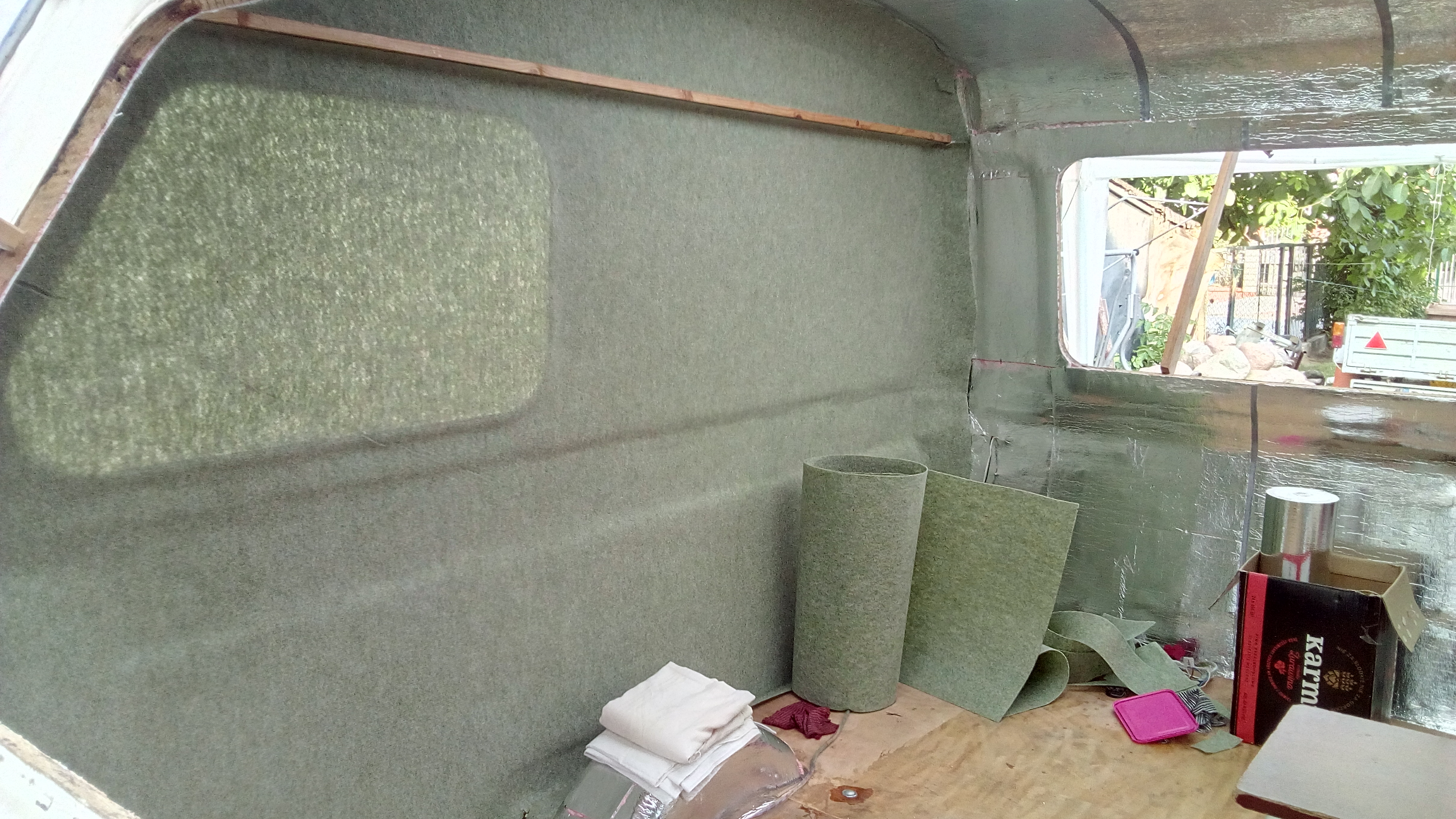 Ogólnie zostały mi się do wyklejenia wykładziną drzwi, nadkola, te 10 cm ścianki co otwierany dach na nich leży oraz sam szyberdach. Szyberdach mam zamiar wziąć na poddasze nieużytkowe (ale ciepłe, obecnie około 20 stopni C) i tam go trącić jeszcze topkotem, a potem wykładzinę na niego nakleić. Ale reszta to nie wiem, pogoda nie sprzyja, jest zimno, po pracy ciemno ...