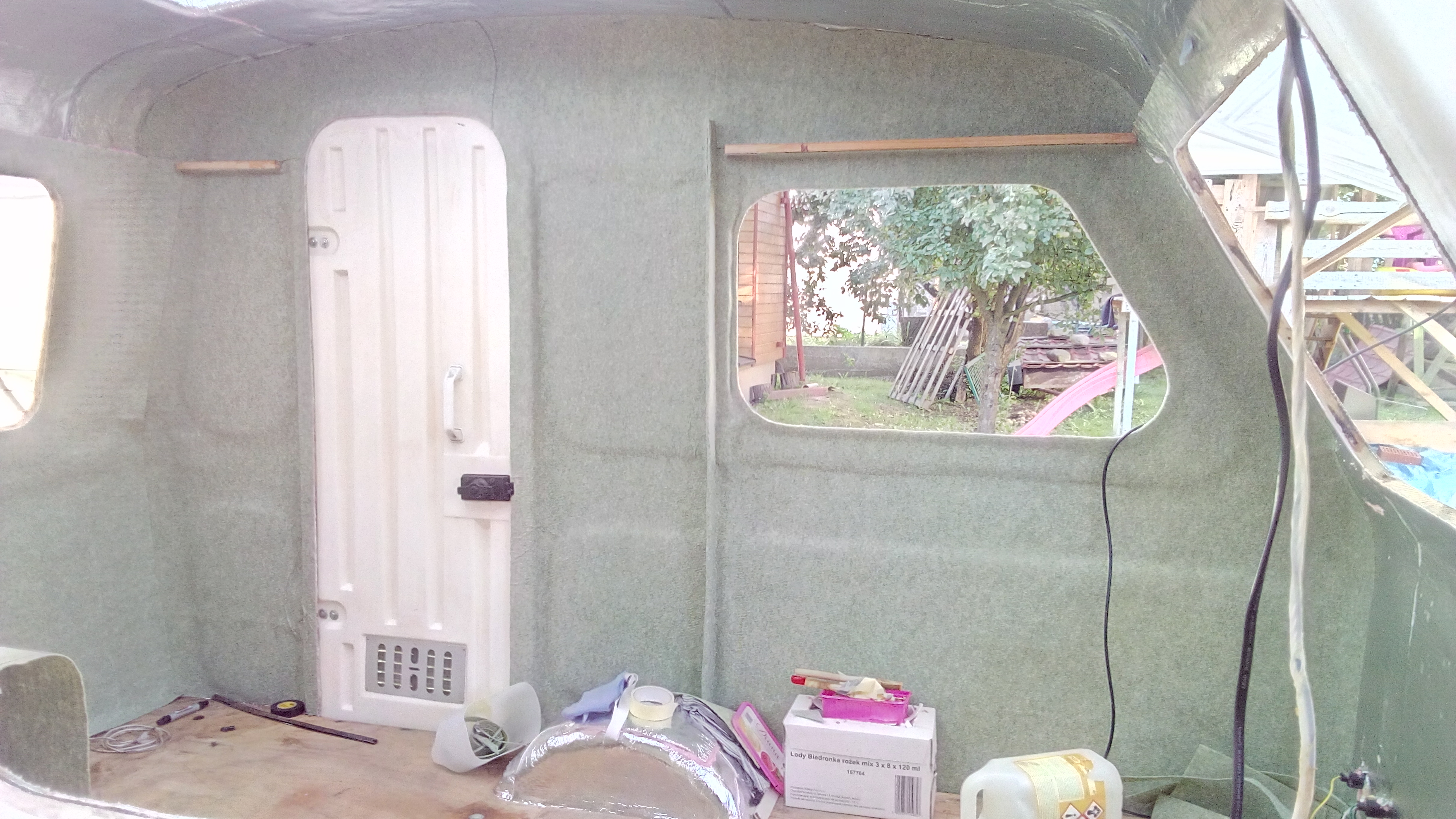 Sposób w jaki ja to robiłem, coby nie uwalić wszystkich brzegów klejem, zwłaszcza kiedy już mamy coś na ścianie wyklejone. Bok dłuższy przyczepki (w sensie ten bez drzwi) wykładzina była klejona jako cały kawałek. Przyłożyłem to do ściany tak jak miało by to przylegać ostatecznie i umocowałem do listwy drewnianej. Następnie podgiąłem dół do tej listwy i przymocowałem na zszywki. Czyli jak to na fotce widać, mam połowę odsłoniętą do posmarowania lepiszczem. Posmarowaną połówkę opuszczałem stopniowo, głaskając dociskałem do ściany. Po kilku minutach czy nastu opuszczałem górę, smarowałem i heja z klejem na ścianę.
