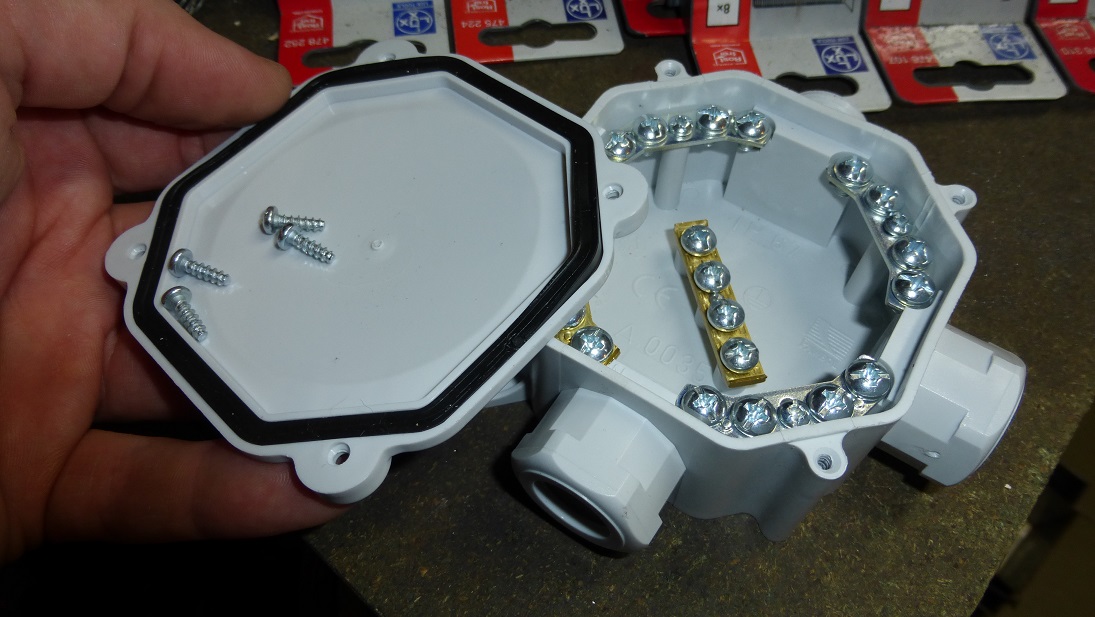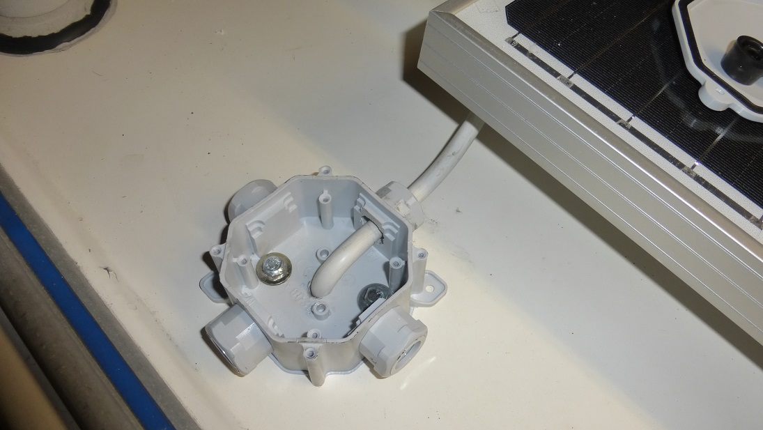 Przejście przewodu 4x2,5mm przez dach za pomocą identycznej jak w wielorybie puszki natynkowej. Ten wzór jest z grubego tworzywa, całość sztywna i pancerna.