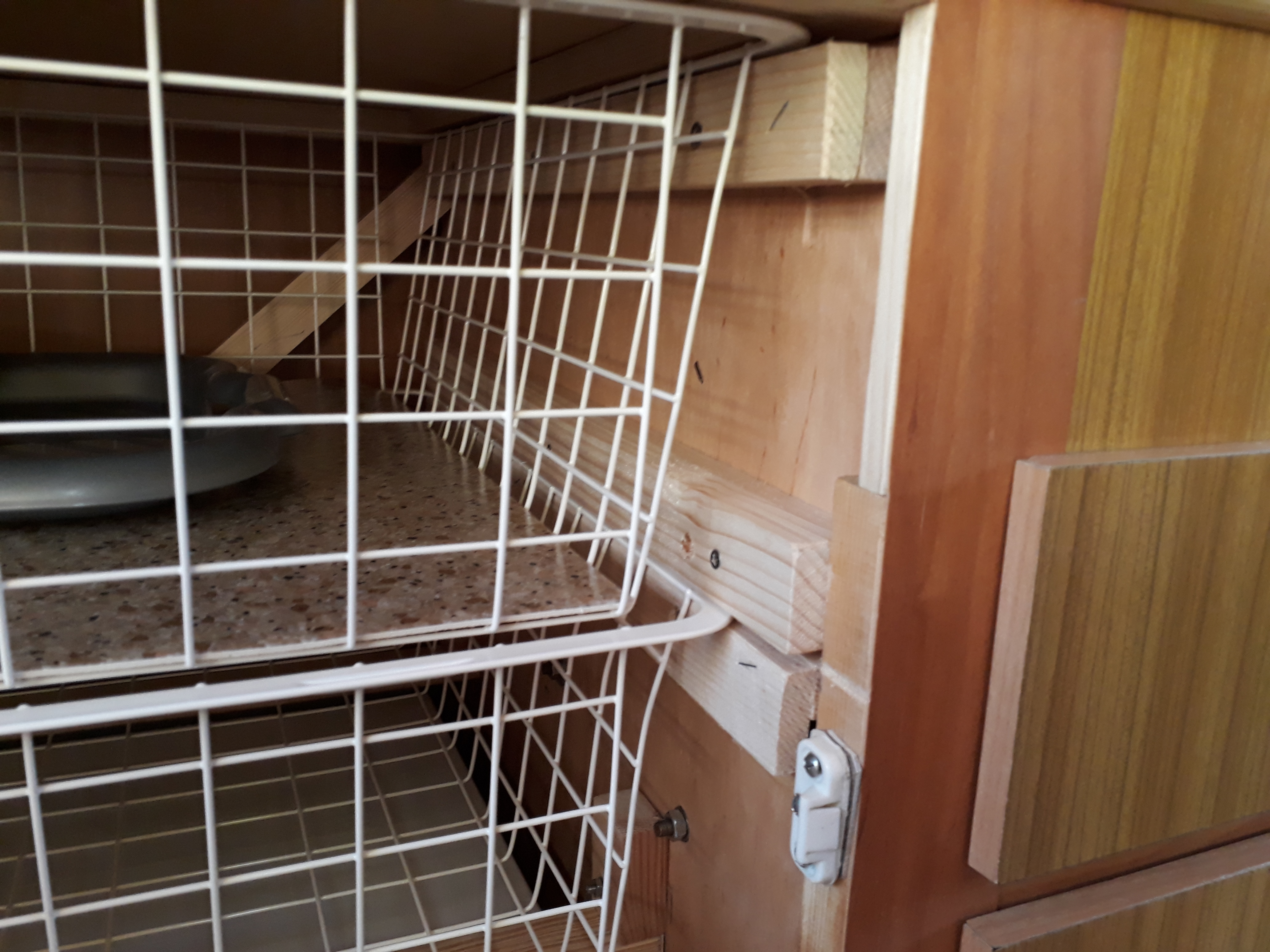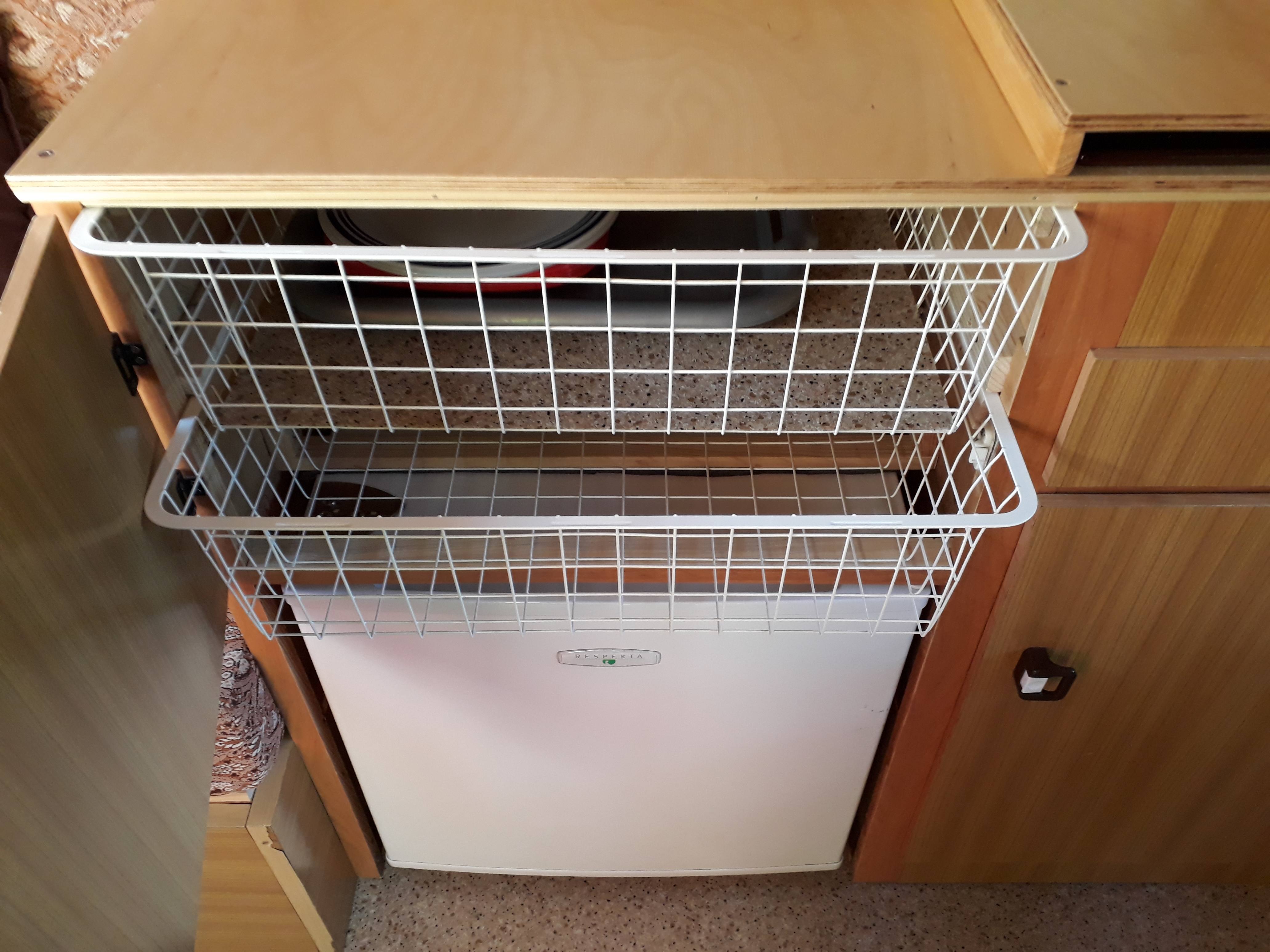 W szafce kuchennej zrezygnowaliśmy ze zlewu, wymieniliśmy blat na taki ze sklejki, wewnątrz zastosowaliśmy zamiast półek koszyki z ikei zawieszone na własnoręcznie wykonanych prowadnicach.