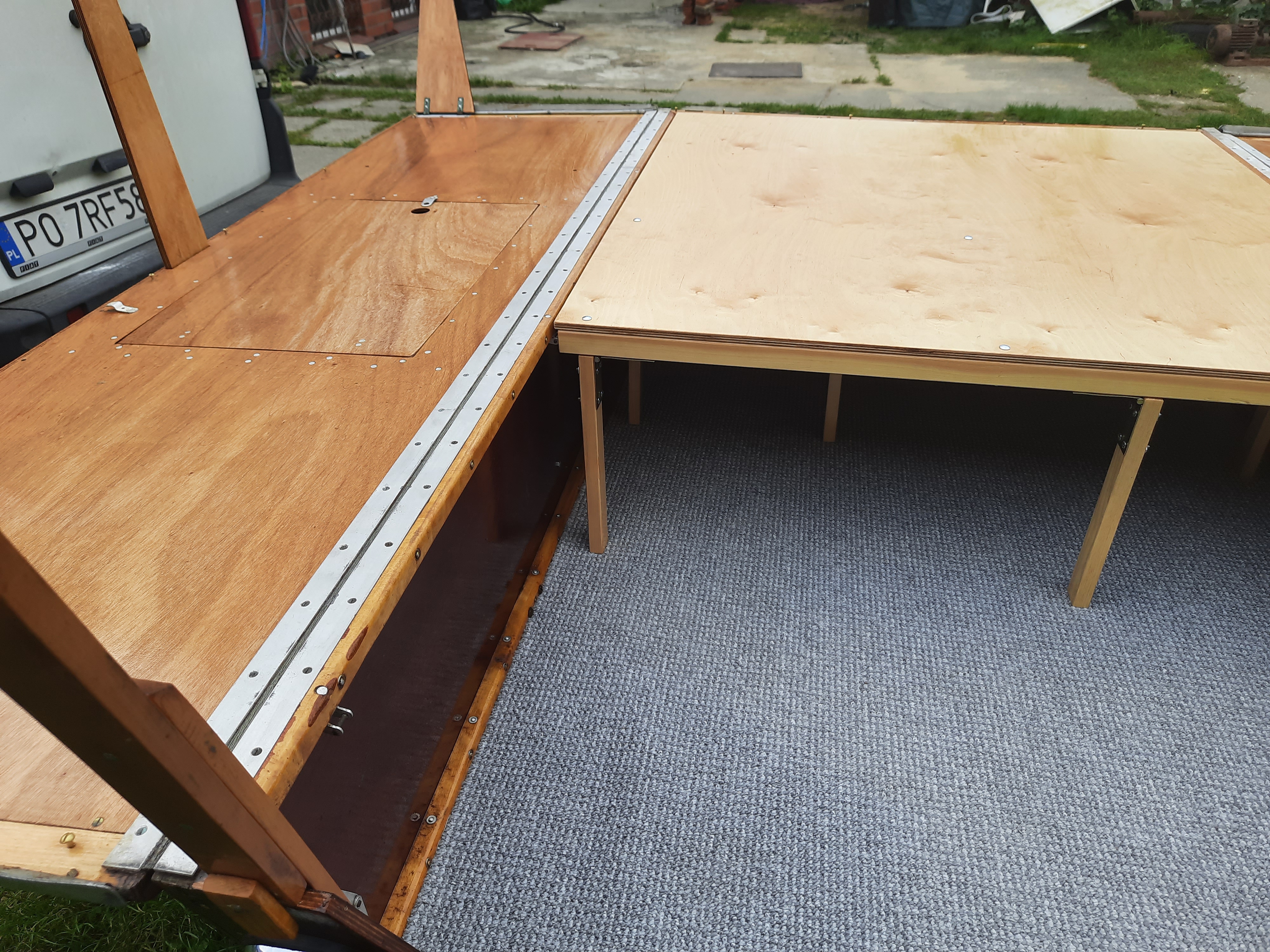 Dorobiłem dodatkowo sklejkę z nóżkami do wstawienia bezinwazyjnie pomiędzy "skrzydła". Taka dostawka da możliwość spania nam z Żoną w poprzek, obok siebie na wygodnym dmuchanym materacu o szerokości 120 cm.