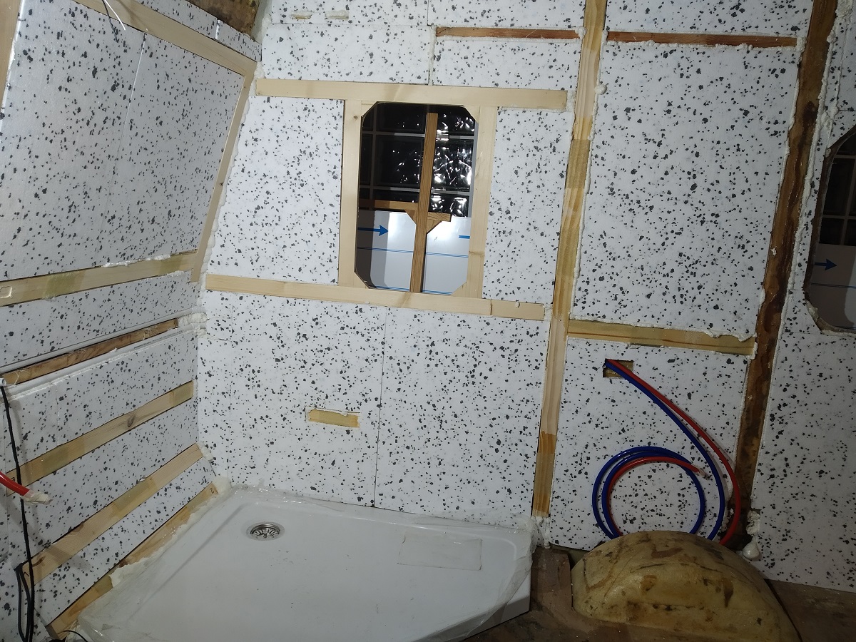 Kantówki zwykłe sosnowe. Malowałem je jedynie lakierem/impregnatem, tak żeby zabezpieczyć drewno przed ew. wilgocią, ale szczerze - to nie ma prawa się ona tam dostać. Dibond - 3mm, obustronnie biały. Uważam, że jest to rewelacyjny materiał na łazienkę! Starałem się robić jak najmniej połączeń. Tam gdzie są zagięcia, frezowałem dibond ręczną frezarką, frezem stożkowym i zaginałem. Uszczelnianie połączeń ścian robiłem Siką. Cała łazienka jest natomiast zabudowana na brodziku Radaway pięciokątnym 80x100. Taki mi się po prostu trafił, ale teraz mogę powiedzieć, że do N126N jest to wymiar optymalny. Jedyny jego minus to nieco większa waga niż "kamperowego". Poza tym same plus - jest nadal biały, nie żółknie, ma gładką powierzchnię, fajnie spływa po nim woda, po kąpieli wystarczy go delikatnie przetrzeć i podłoga sucha. Generalnie łazienka jest szczelna i łatwa w utrzymanu czystości. Bez żadnych zasłonek, folii, itp. Dibond był klejony lub przykręcany w kilku miejscach do wcześniej specjalnie wlaminowanych listew. Do klejenia styropianu a potem dibondu używałem kleju w pianie Tytan 60s.