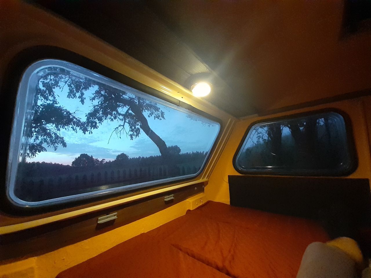 Jeśli chodzi o układ, to trochę wyszedł sam (przednia część mebli była nie do uratowania lub w ogóle ich nie było), a trochę był wynikiem przemyśleń. Szafę chciałem zostawić, łóżko/stół też, lewą podstawę łóżka postanowiłem odciąć na wysokości końca nadkola (równo z szafą) – w ten sposób cały przód przyczepy jest wolny – jest to miejsce do zabawy, ale nie tylko. Na śrubach mocujących budę zamontowałem solidne uszy do mocowania ładunku – będzie tu można zamocować moduł kuchenny (który mam nadzieję zrobić przez zimę), platformę do przewozu rowerów lub położyć na podłodze materac gdybyśmy jechali gdzieś we trójkę.