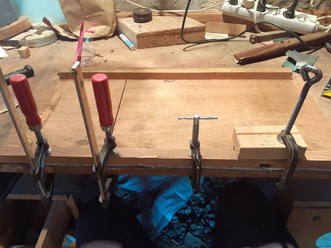Z górnych półek zrezygnowałem, zrobiłem jedynie tę z tyłu (z lampą LED 12V nad stołem), listwy, które zostały na ścianach wykończyłem kątownikiem 30X30 mm – powstały w ten sposób mikro-półki na jakieś drobiazgi, ale można też na nich zawiesić pojemniki z IKEI, co już nie jest takie głupie :)