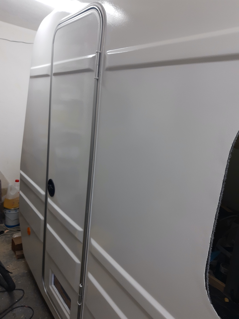 Po zamontowaniu ościeżnicy, co zajęło mi kilka godzin ze względu na krzywiznę laminatu, w końcu udało mi się zamontować drzwi. Niestety nie mam zdjęć ich konwersji, ale musiałem je wszystkie odkleić. Wymieniłem całe drewno w środku, naprawiłem i wzmocniłem pęknięty laminat, wypełniłem wnętrze styropianem, skleiłem klejem PUR i oczywiście pomalowałem. Wnętrze pokryłem wykładziną nośną, która znajdzie się również na ścianach bocznych.