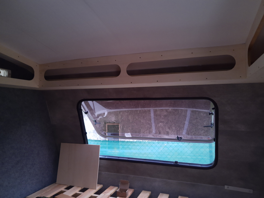 Zmontowałem również podstawę dużego łóżka z listew 3x2 i 3x3. Celem było wykonanie łóżka o szerokości 140 cm, z jak największą przestrzenią do przechowywania i miejscem na szufladę z przodu. Ponieważ ogólnie w kamperze jest mało miejsca do przechowywania, chciałem maksymalnie wykorzystać obszar spania.