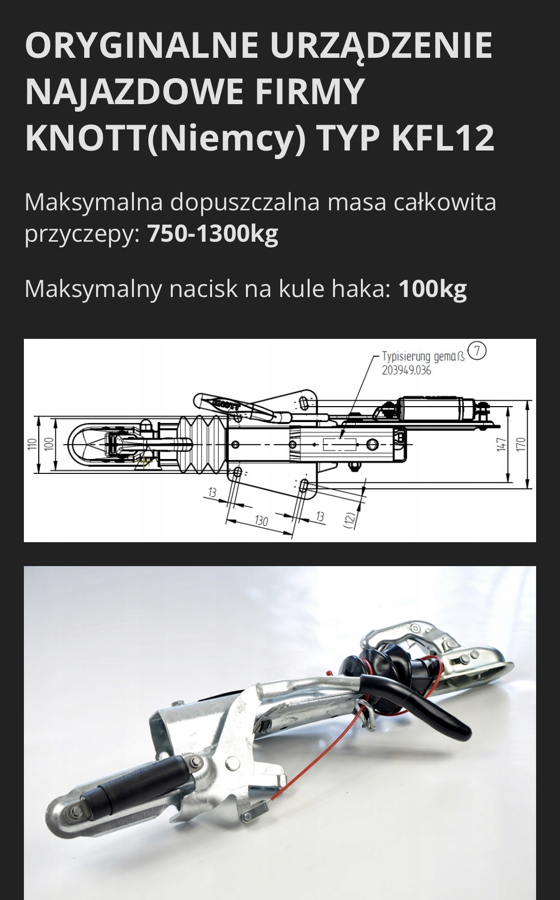 Rama ubrana w pełen osprzęt KNOTTa: oś, hamulec, podpory, koło manewrowe i chlapacze z Niewiadowa.