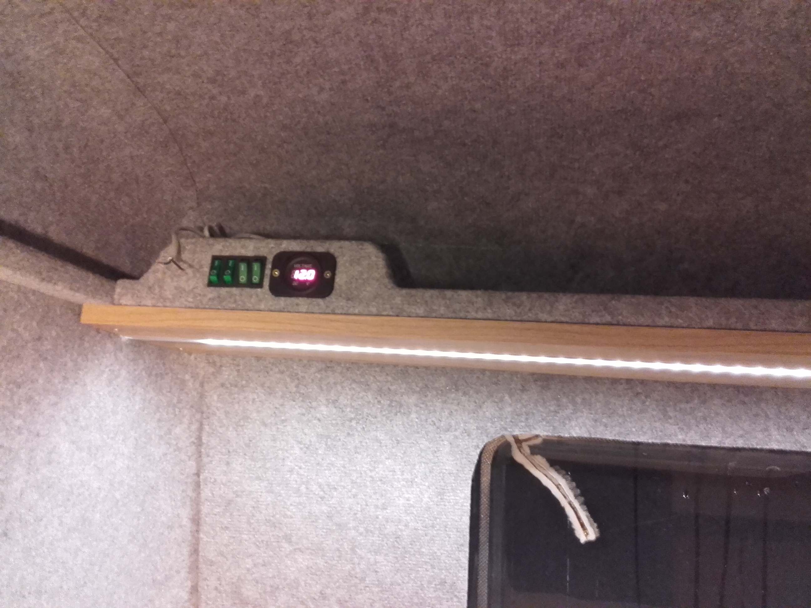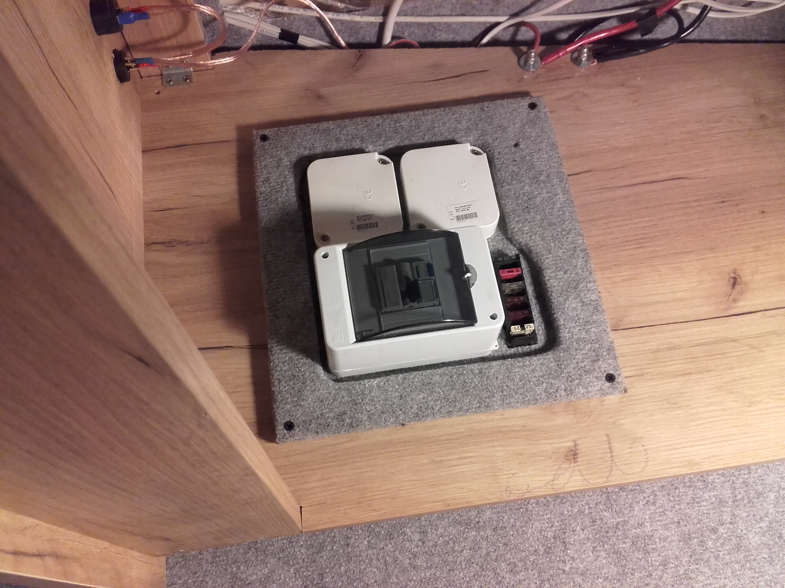 Dziś pół dnia spędzone z lutownica. Z instalacją poszło dość zgrabnie szybciej niż się spodziewałem. Nie ma tu żadnych fajerwerków. U góry voltomierz i przełączniki światło tył i prz. światło zewnętrzne czwarty przełącznik poprzez przekaźnik dla czterech gniazdek zapalniczki. Dwa na blacie dla tv i anteny jedno w szafce na lewym nadkolu dla lodówki przenośnej i ładowarki telefonu. I pompka wody. Wszystko puszczane przez bezpieczniki. 220v przez roznicowke z zabezpieczeniem cztery gniazdka jedno dla lodówki dwa wolne i jedno jeszcze dojdzie przy rozdzielni dla prostowniki automatycznego 15A którego zaciski mogę zapinac w szafce na srubach redukujacych średnicę przewodów. No i to chyba na razie tyle. Pod koniec pomalowalem jeszcze i zakrecilem na probe drzwiczki szafy.