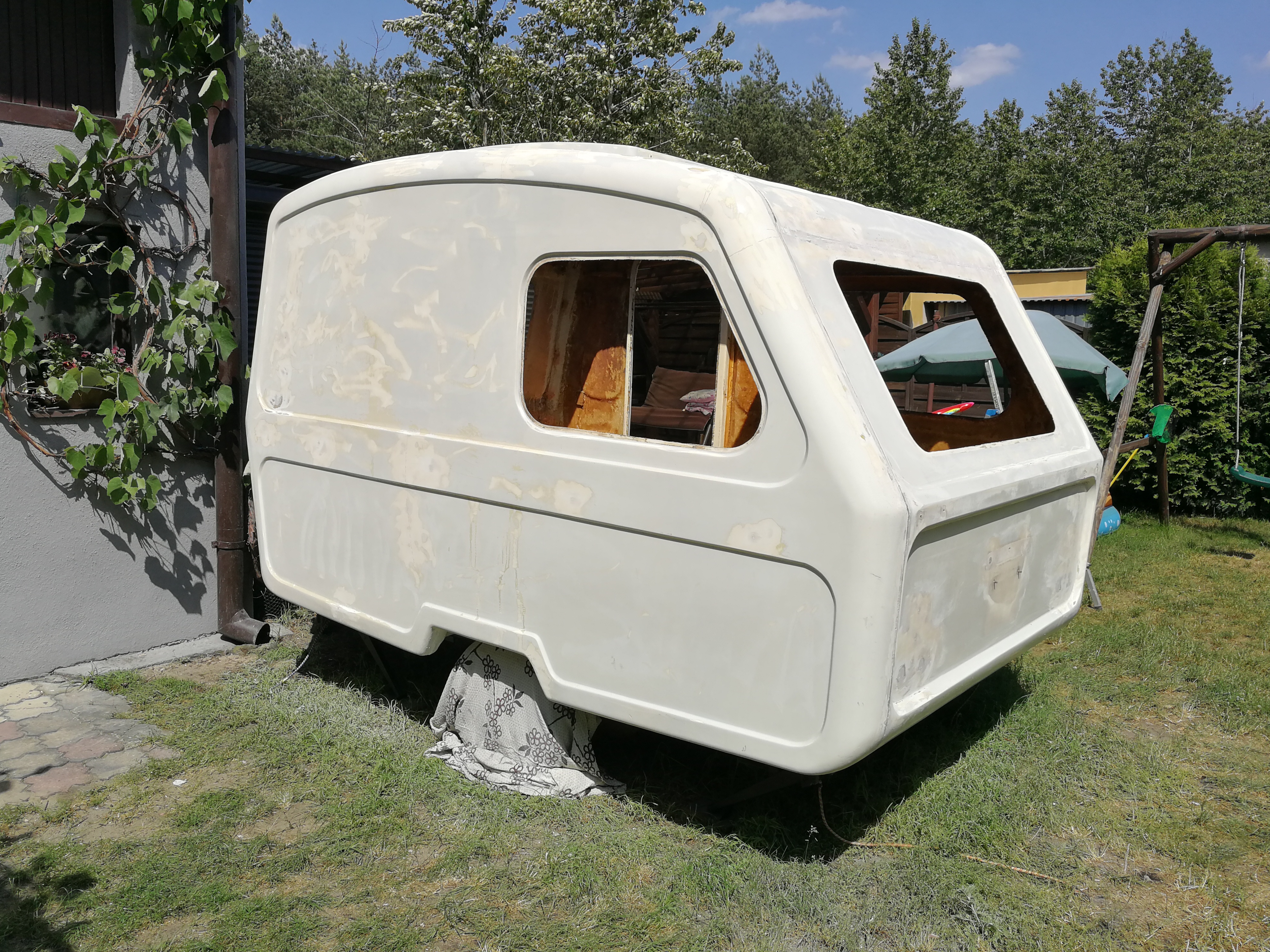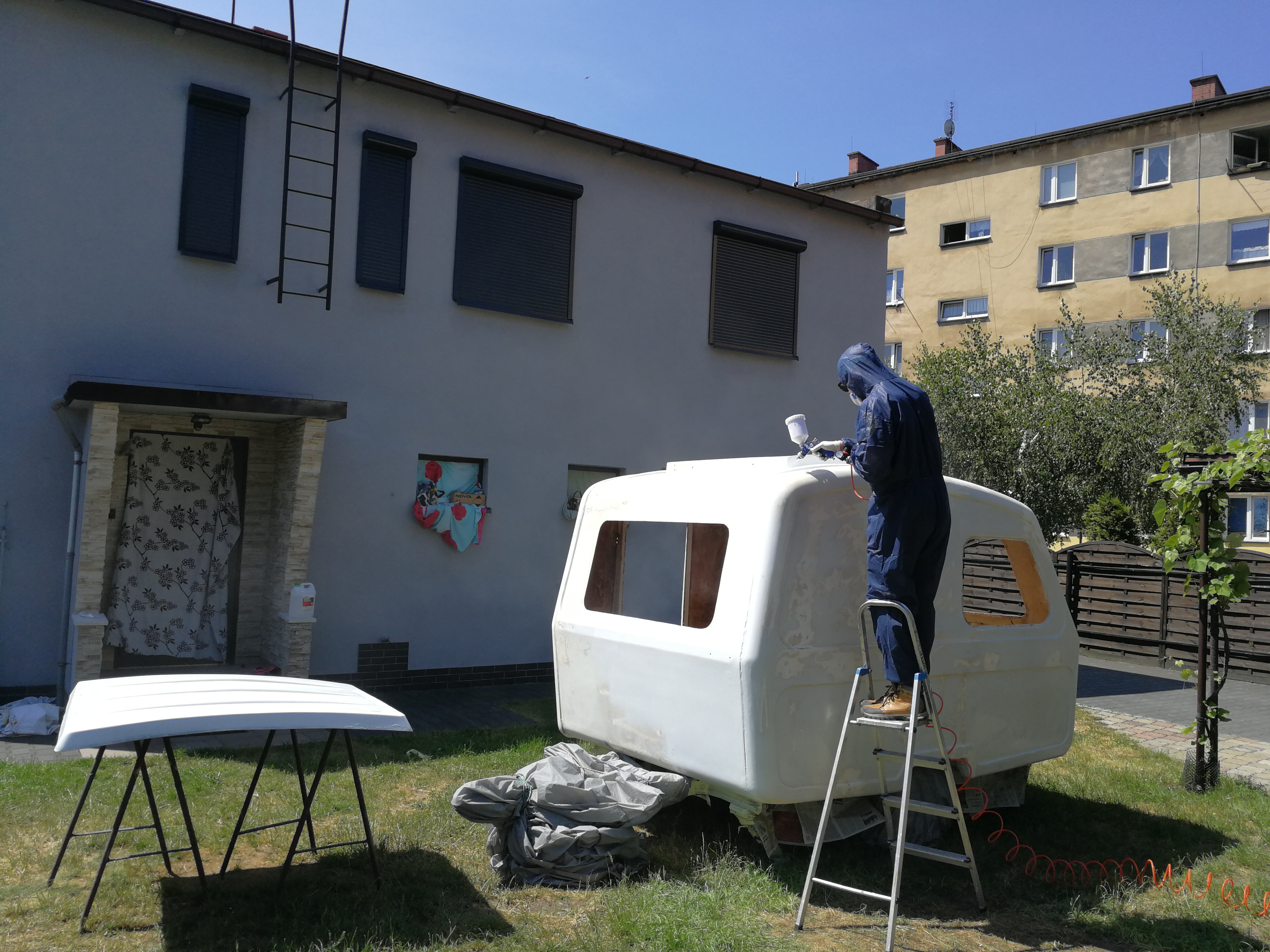 Jestem juz po lakierowaniu budy i szyberdachu. Lekko nie było:) Teraz czas na schnięcie i myślę, żeby tak za 4 dni zrobić polerkę- poliuretan do tego czasu powinien już stwardnieć. Sporo pracy przy tej przyczepie:)