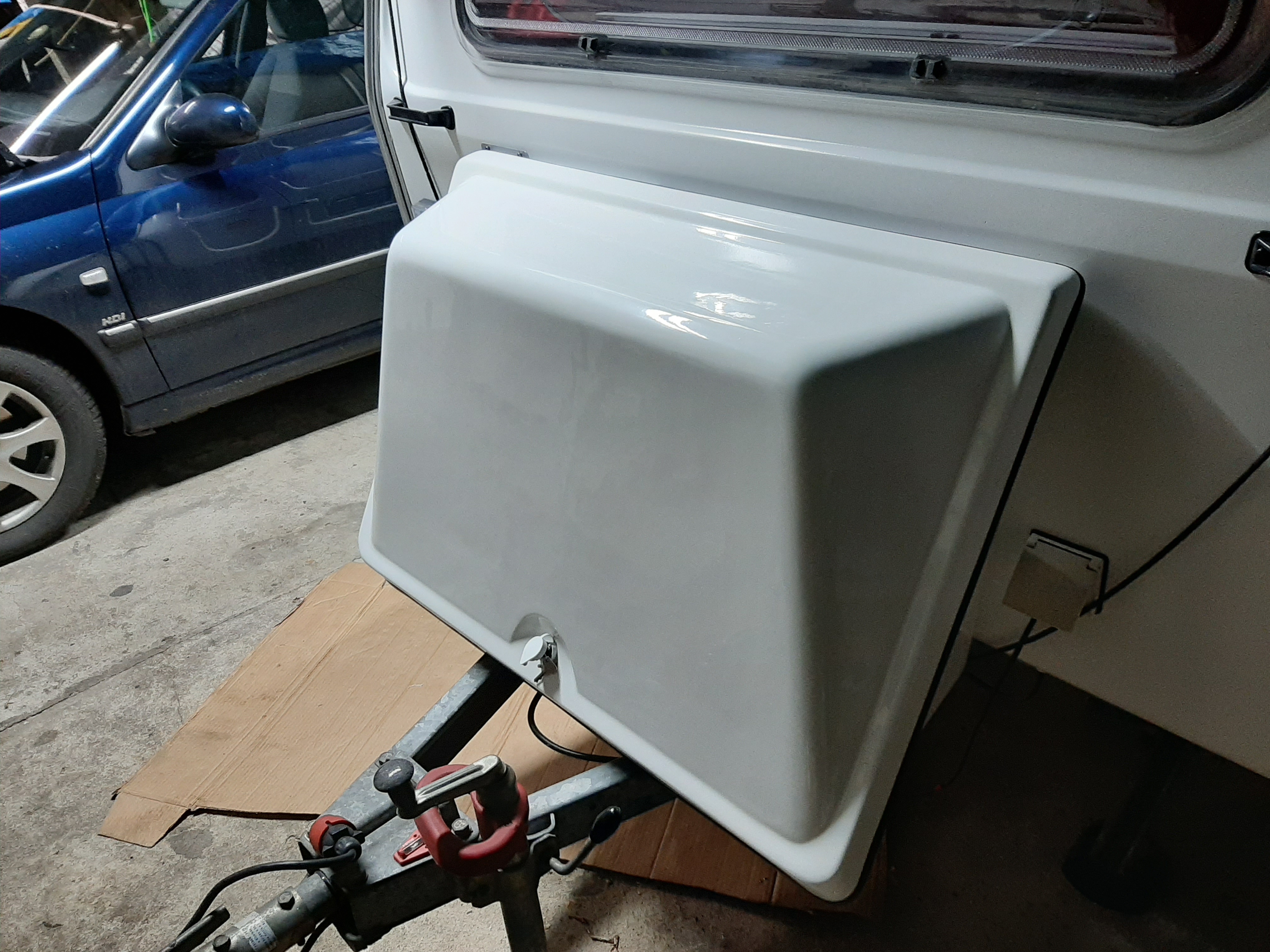Dzisiaj zrobiłbym prostokątne wycięcie - duże powiedzmy 20cm na 20cm (pi razy oko, chodzi mi o to że duże) zamiast małej podcinki (wielkość podcinki jest ograniczana tym, aby nadal zostawał naddatek laminatu z przodu kufra, żeby woda nie wpadała). I tam byl zrobił klapkę na zawiasie czyli taką "mini klapkę w dużej klapie". Jedno co to trzeba tak wyrzeźbić, żeby woda nie lała się do środka. Tylko wtedy pokrywę kurfra trzeba obowiązkowo wzmocnić np. wlaminowanym kątownikiem.