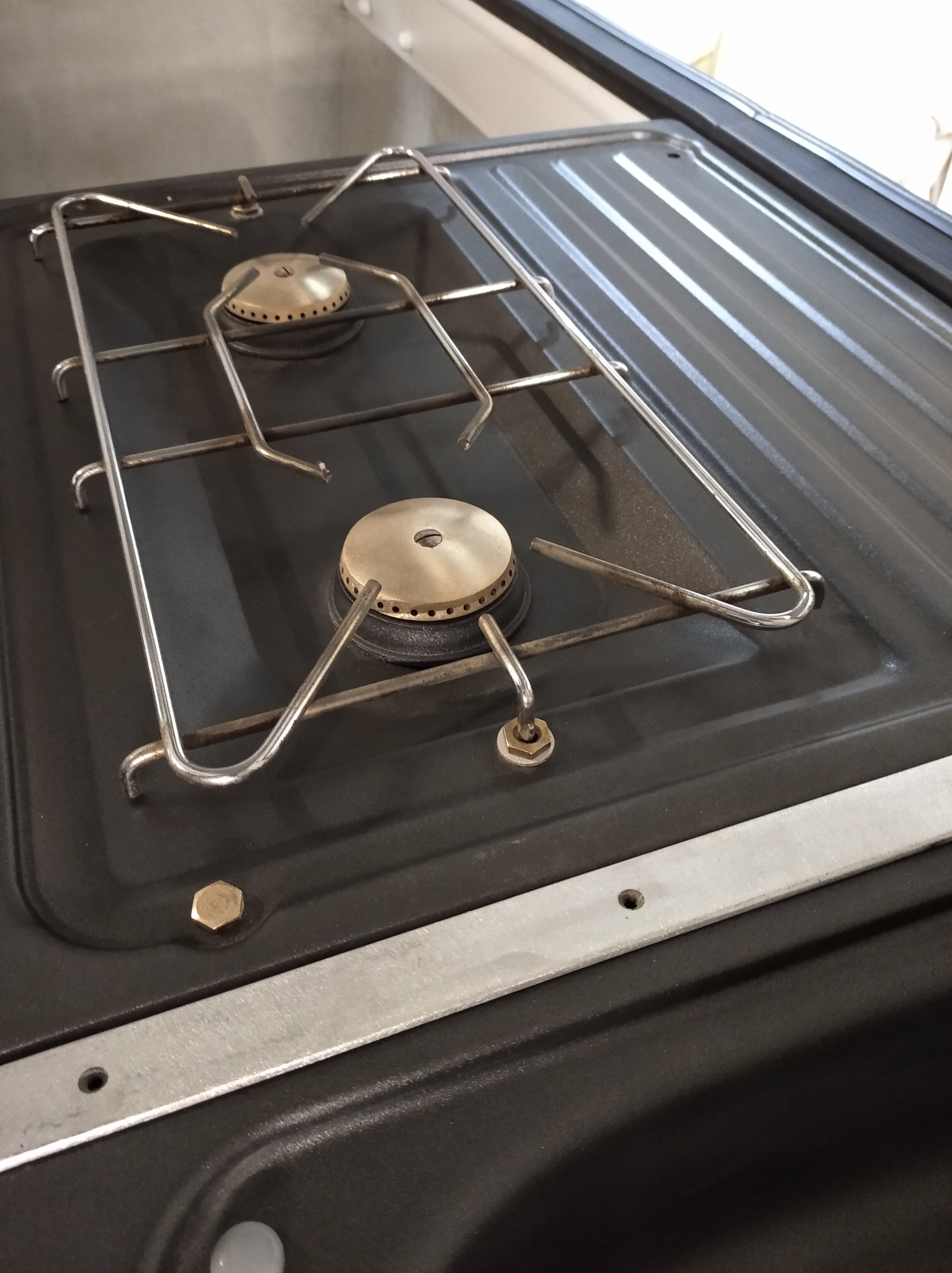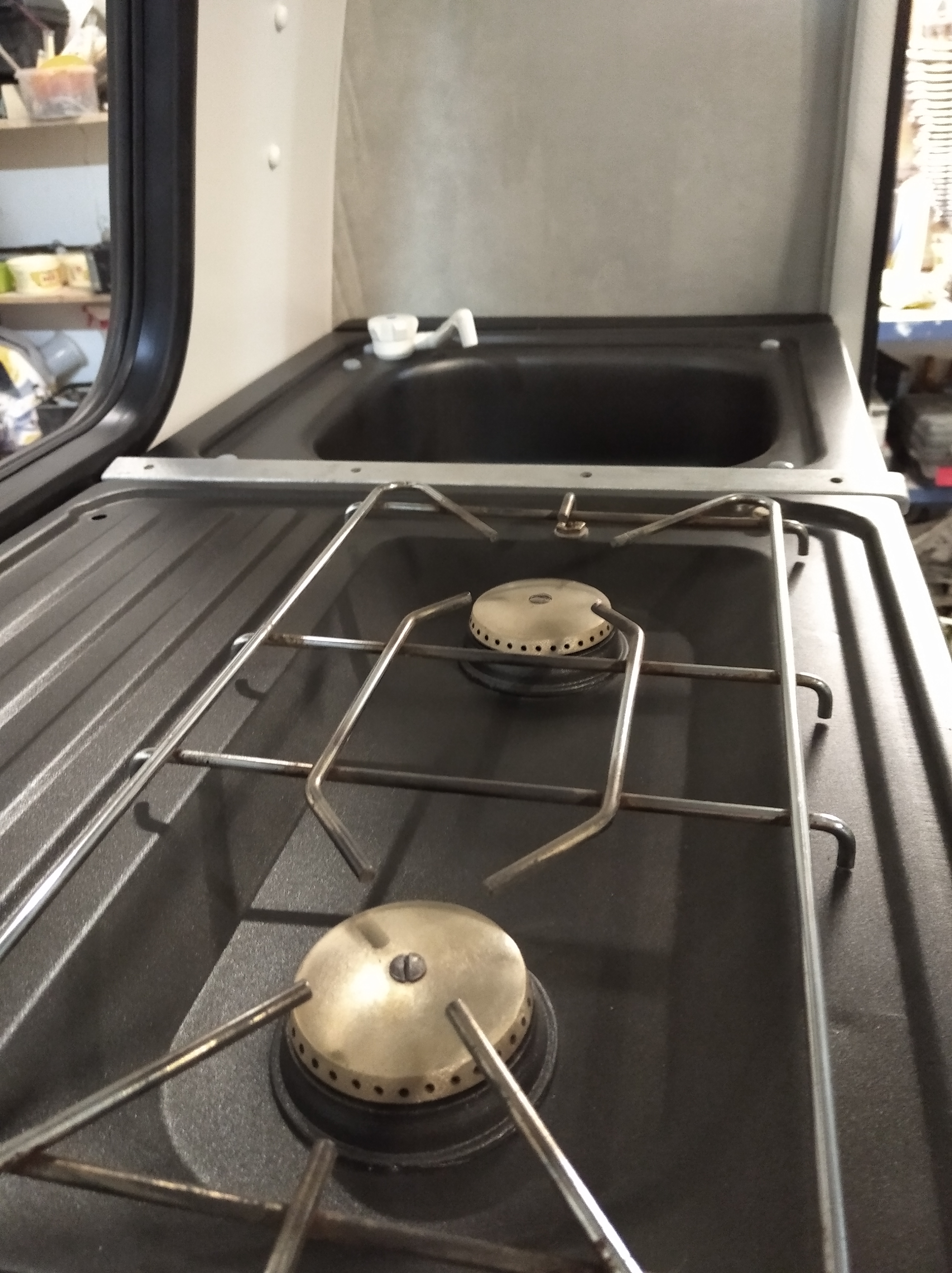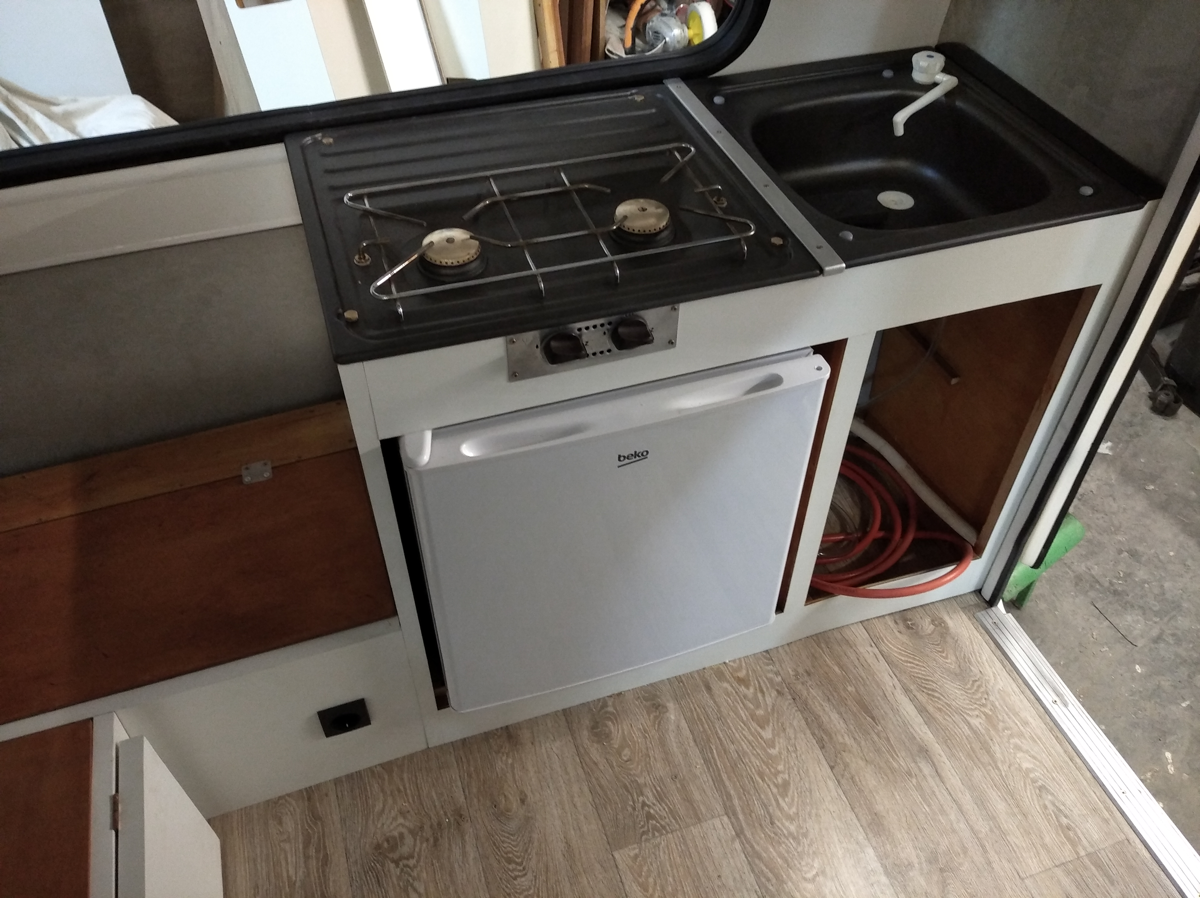 Meble z przodu i na lewej stronie już spięte na gotowo. Gaz, woda i odpływ podpięte.