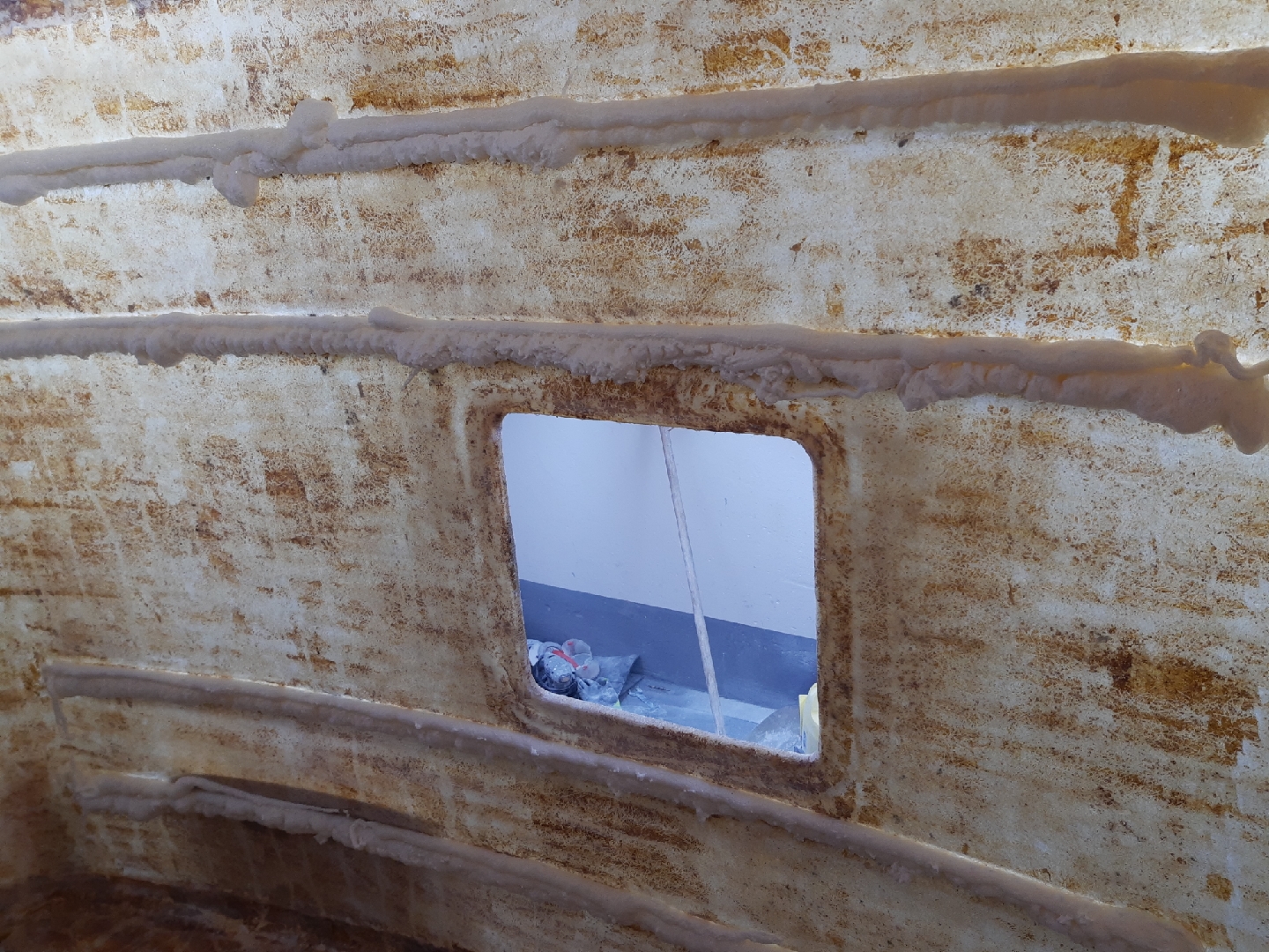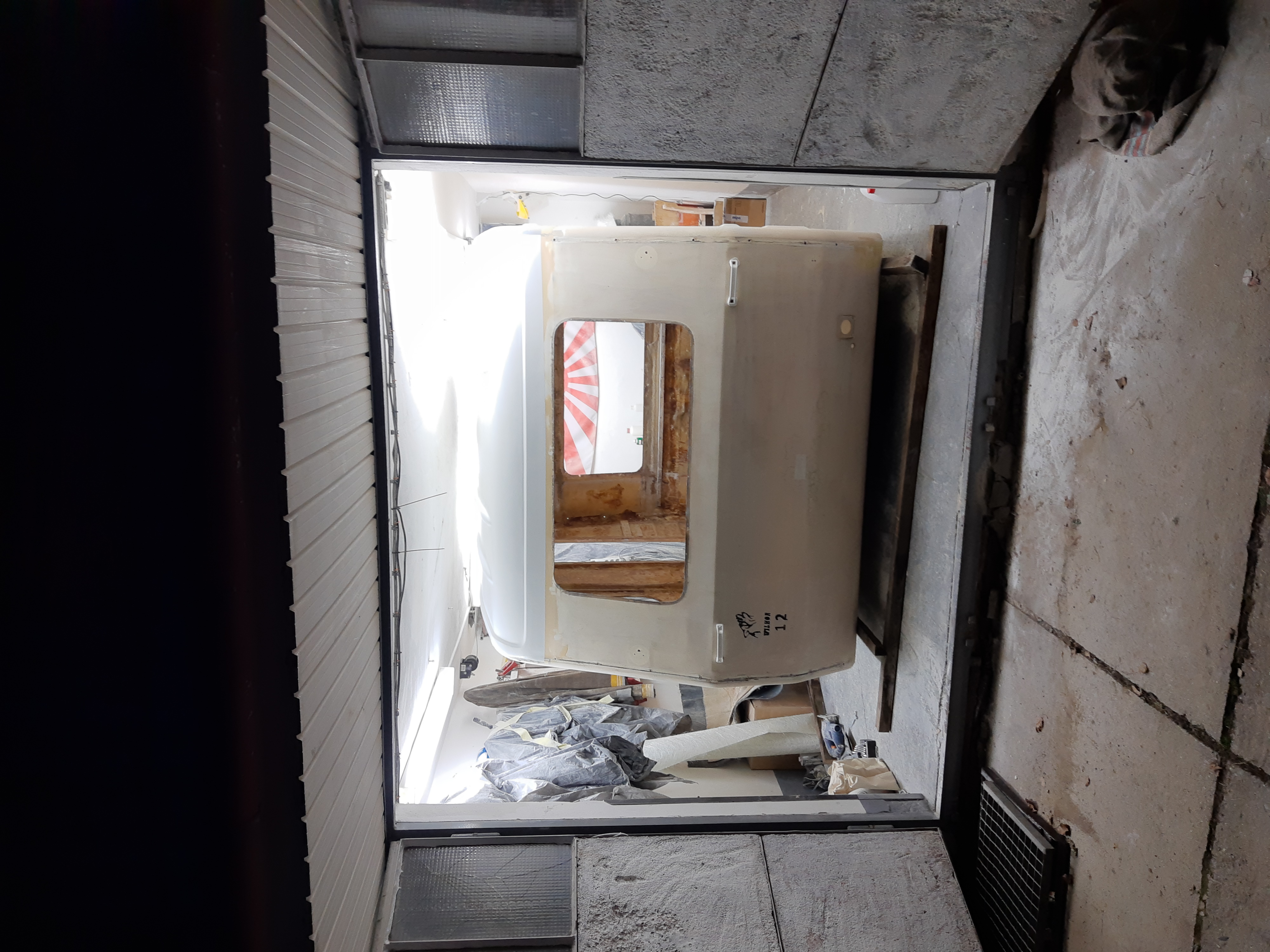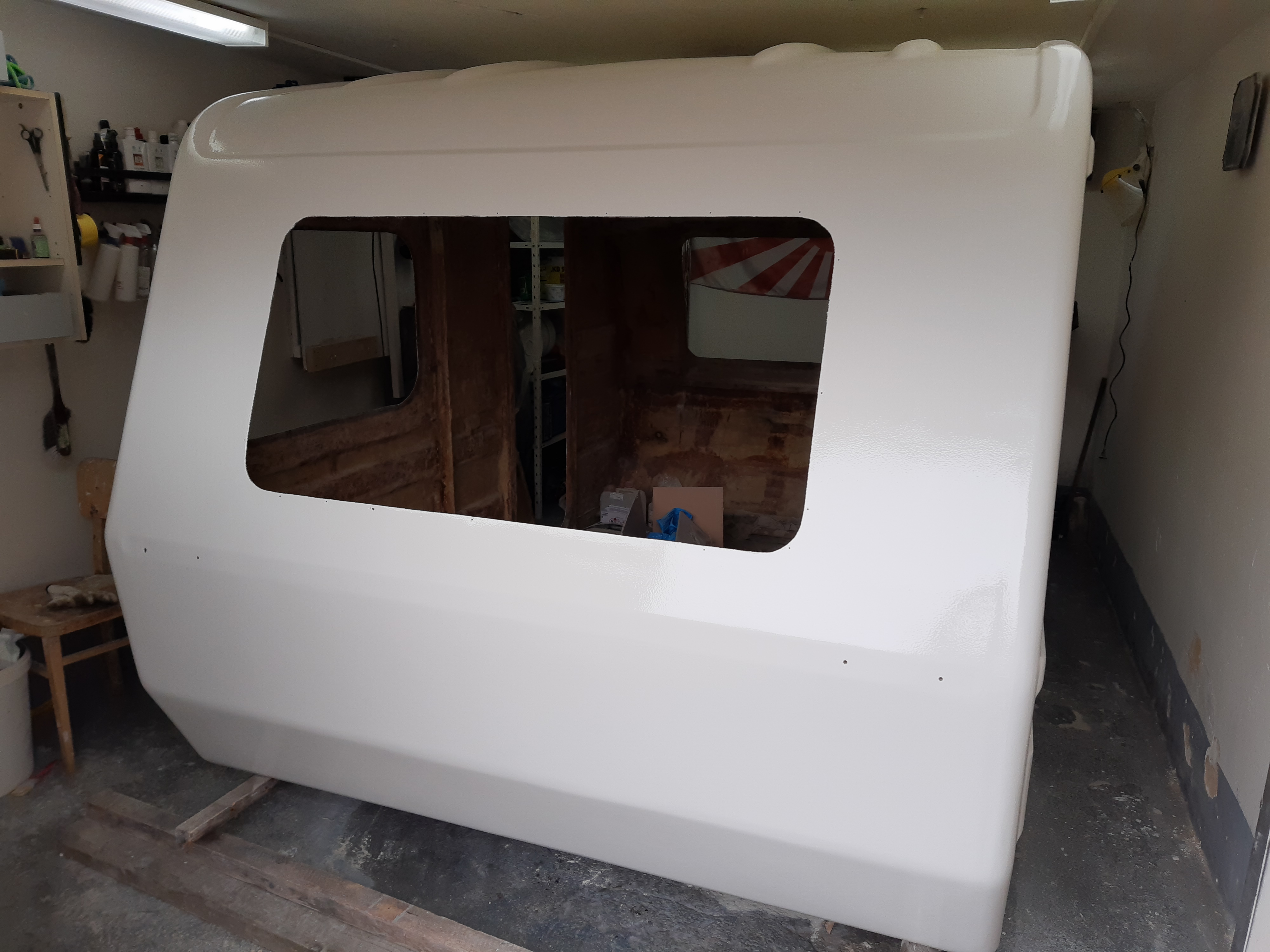 Skorupę odwróciłem z powrotem na prawą stronę i teraz czekam na zalaminowanie tylnej szyby (ze względu na łóżko piętrowe) oraz szlifowanie i uszczelnienie uszkodzeń po bokach. Ale boki skorupy są w bardzo dobrym stanie, więc mam nadzieję, że teraz będzie trochę szybciej :)