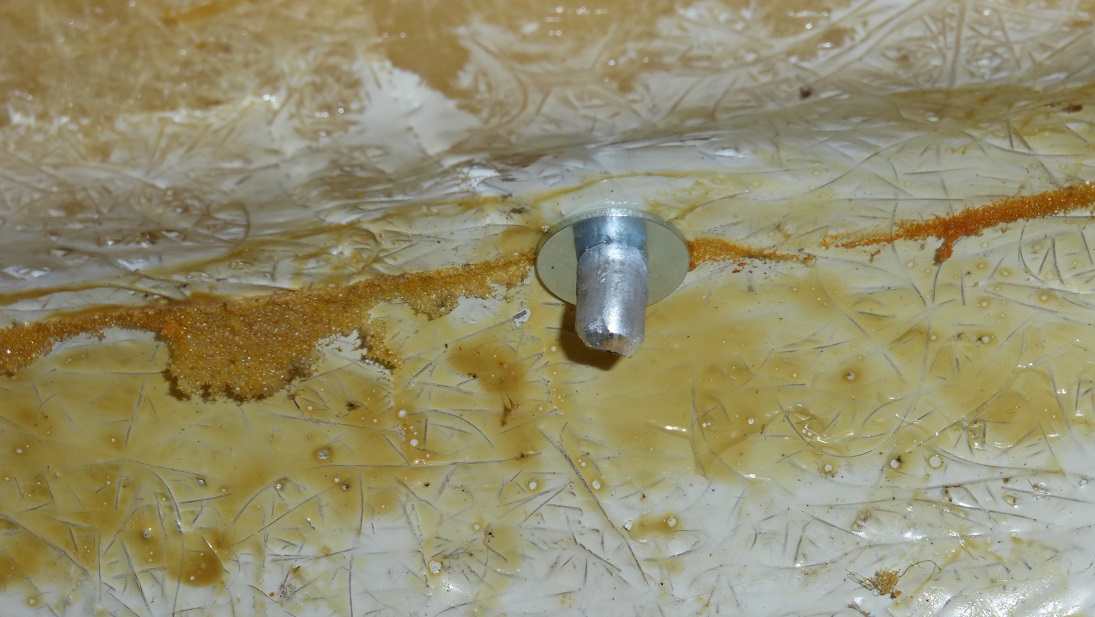 Zdjęte zostały wzdłużne listwy alu i oczyszczone wraz z laminatem pod nimi. Ku mojemu zdziwieniu nie było tam żadnego uszczelnienia poza kilkoma glutami silikonu. Podejrzewam, że dołożył go poprzedni właściciel. Chyba szczelność miała być zapewniona dzięki zalaminowaniu śrub od wewnątrz
