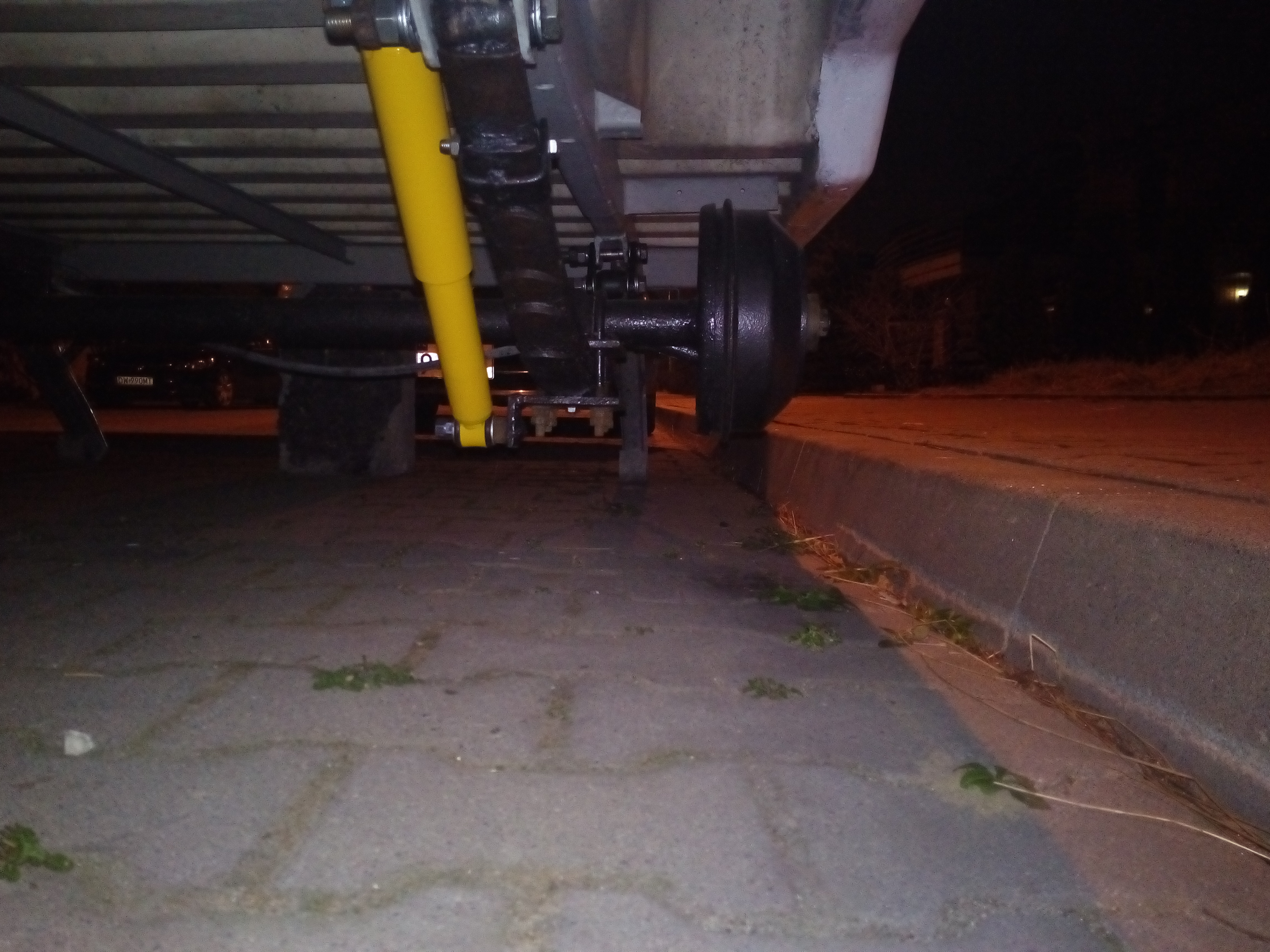 Z odkręceniem resorów to specjalnego problemu nie ma - 4 śruby, na których wszystko wisi + 2 od amortyzatorów + dwie linki hamulcowe i cały zespół zawieszenia wyjeżdża spod przyczepy. Problemem dla mnie jest to, że najpierw mam nachylony w dół podjazd do garażu i inaczej niż wspomagając się samochodem nawet nie widzę jej wprowadzania