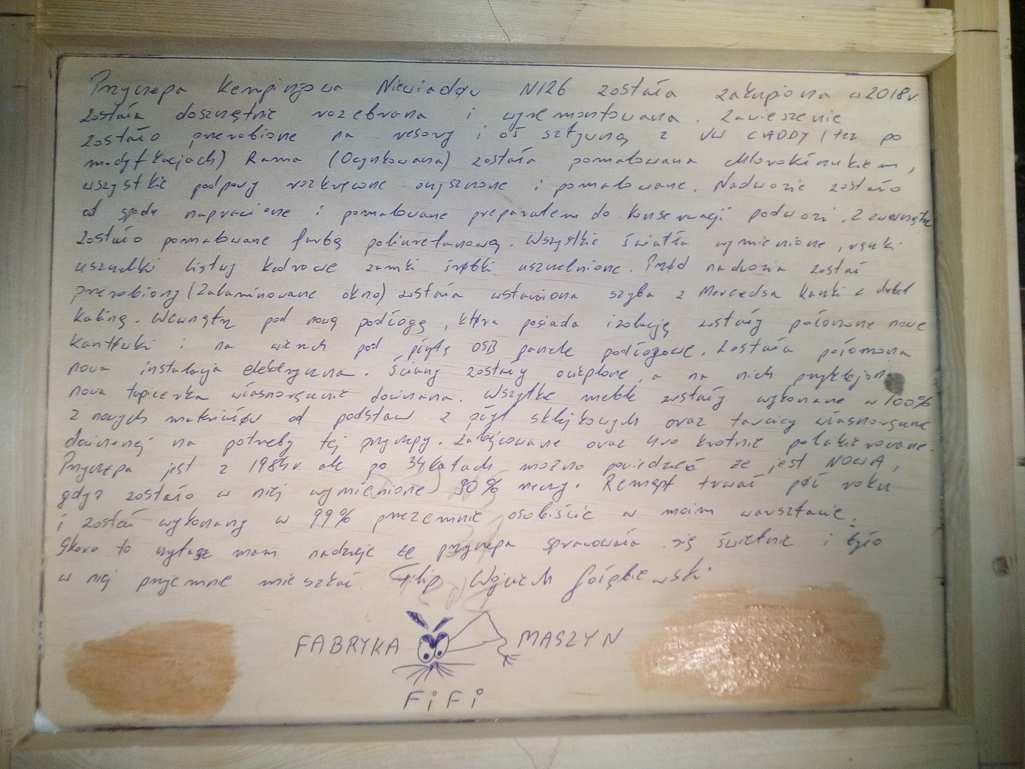 RAFALSKI socrealizm w sumie bardziej będzie pasować masz racje, miło słyszeć że widać w nich lata 60 i porównanie do jachtu takie założenie było. Florida_blue list jest schowany w drzwiach od słowojki, kurcze to moja pierwsza kapsuła czasu i k..a faktycznie zapomniałem daty...i co teraz już posklejane.... Drzwi jak na razie pomalowane z jednej strony od środka. I zamontowałem nowe zaczep przyczepy, nie jest to mercedes wśród zaczepów, ale 100 razy lepsze od tego z 84 roku. Wykonałem dzisiaj jazdę próbną w środku przyczepy celem co lata co nie lata i po za mocowaniem telewizora-polepszymy jest gitara zawieszenie zrobione przez zemnie robi swoją robotę powinienem być zadowolony.