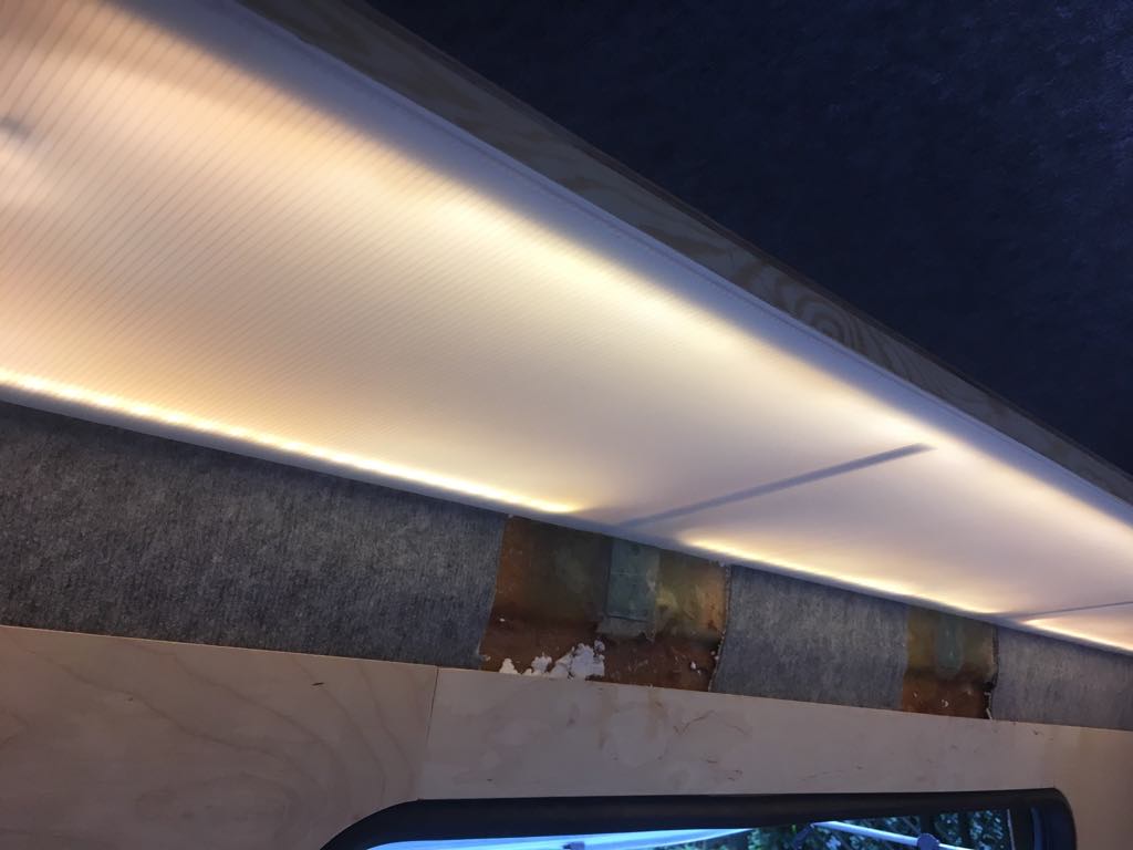 Najwięcej pracy zabrały nam panele swiet(l)ne:) Półką brakowało wykończenia od spodu. Widać było konstrukcję a ledy raziły po oczach. Tak więc, dzięki pomysłowi mojego teścia spody półek wzbogaciły się o maskownice z poliwęglanu komorowego. Materiał bardzo ładnie rozprasza światło a całość prezentuje się nieźle.
