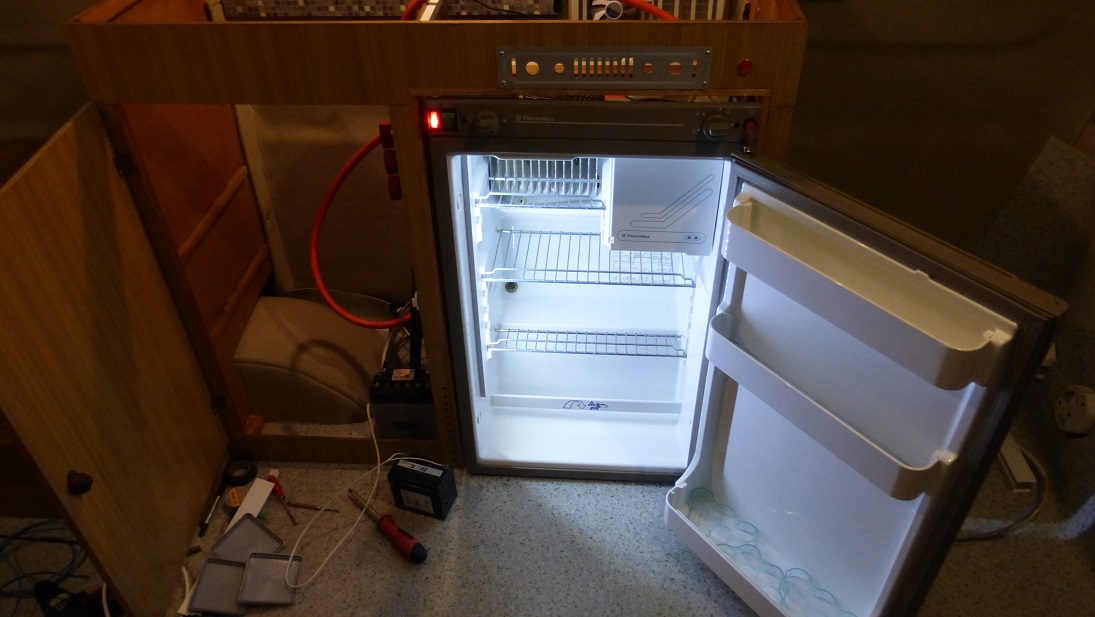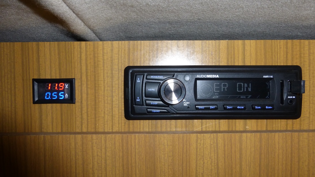 Słabo to wygląda ale nie będzie tego widać, nikt pod kuchenkę nie zagląda. A te białe uchwyty będą trzymały przewody gazowe do lodówki i kuchenki. Cała elektrownia śmiga już pełną parą, panel ładuje, radyjko gra, nastała światłość