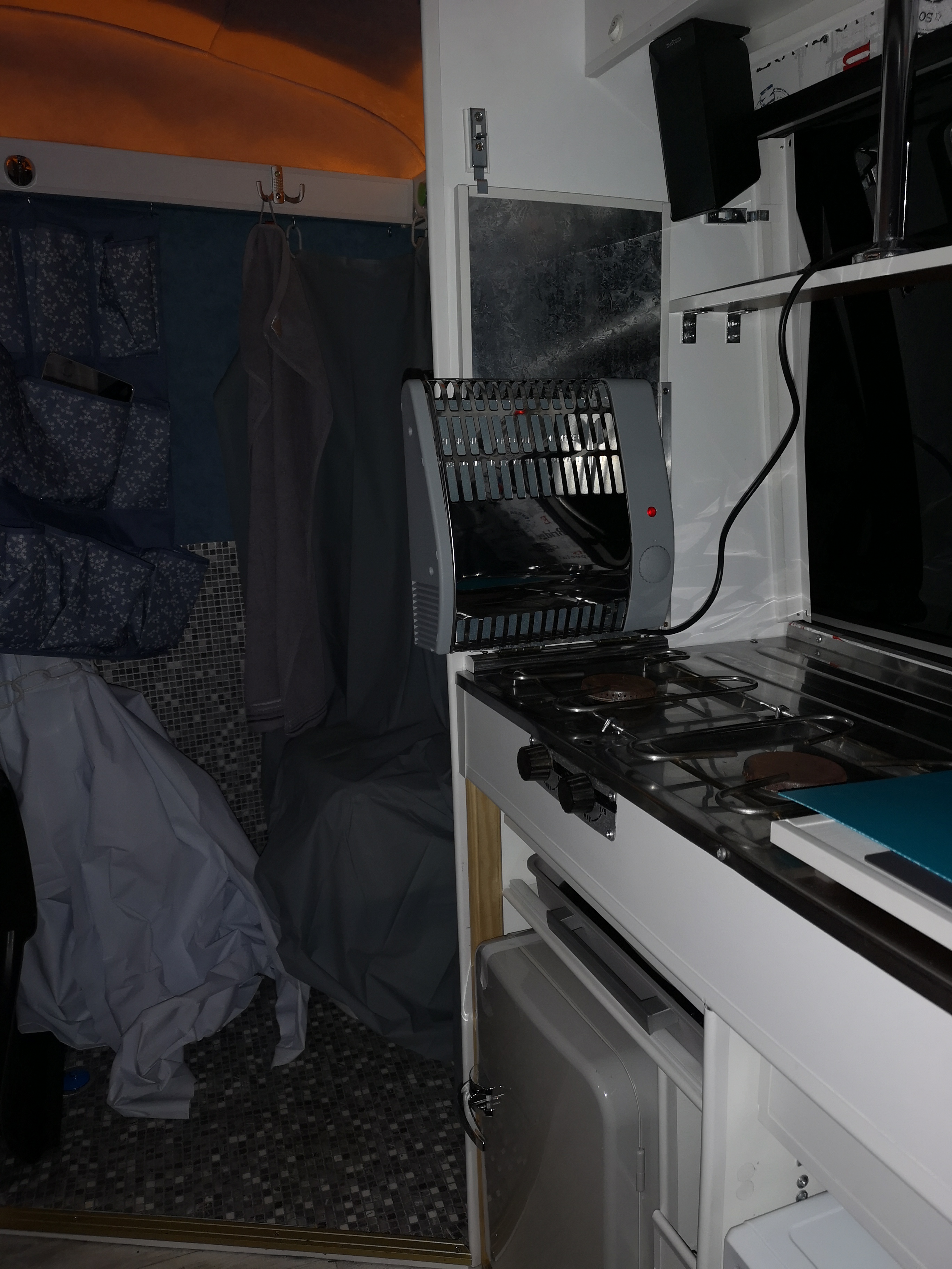 Co do montażu grzejnika to mam już każdy skrawek przyczepy zagospodarowany i nie chciałem żeby mi jakoś przeszkadzał. Dlatego wykorzystałem blat osłaniający kuchenkę . Do blatu przykryciłem na stałe dwie śrubki na które w razie potrzeby można zawiesić grzejnik. Bok grzejnika jest plastikowy i praktycznie w ogóle się nie grzeje także nie ma się jak oparzyć. Efekt końcowy poniżej na fotkach.