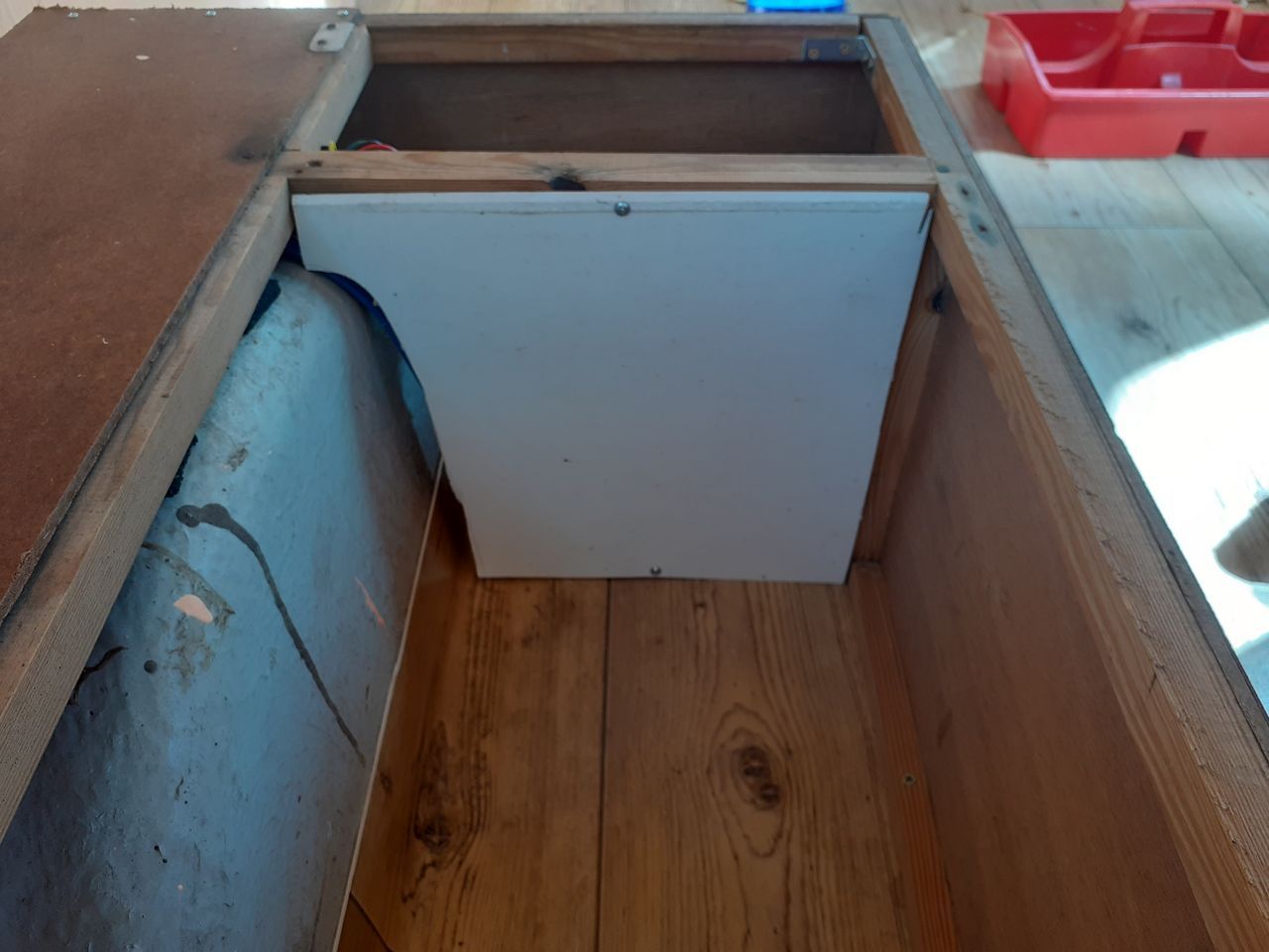 Jeśli chodzi o układ, to trochę wyszedł sam (przednia część mebli była nie do uratowania lub w ogóle ich nie było), a trochę był wynikiem przemyśleń. Szafę chciałem zostawić, łóżko/stół też, lewą podstawę łóżka postanowiłem odciąć na wysokości końca nadkola (równo z szafą) – w ten sposób cały przód przyczepy jest wolny – jest to miejsce do zabawy, ale nie tylko. Na śrubach mocujących budę zamontowałem solidne uszy do mocowania ładunku – będzie tu można zamocować moduł kuchenny (który mam nadzieję zrobić przez zimę), platformę do przewozu rowerów lub położyć na podłodze materac gdybyśmy jechali gdzieś we trójkę.