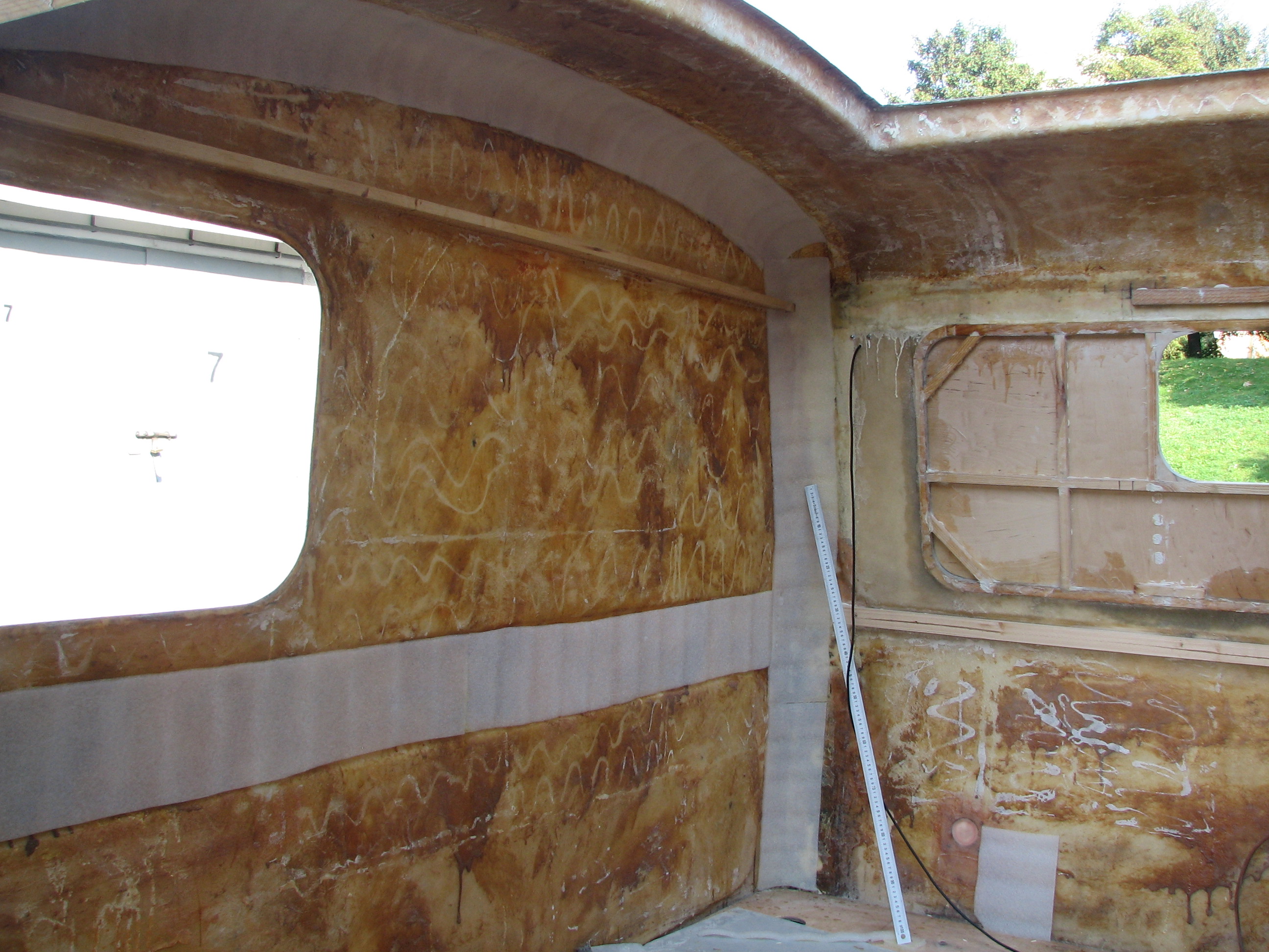 Tu ujawniły się pewne mankamenty mojego pomysłu na ocieplenie budy pianką 10mm i wyrównanie tą pianką "przetłoczeń" w skorupie. Po pierwsze pianka nie miała równej powierzchni, były na niej fale.