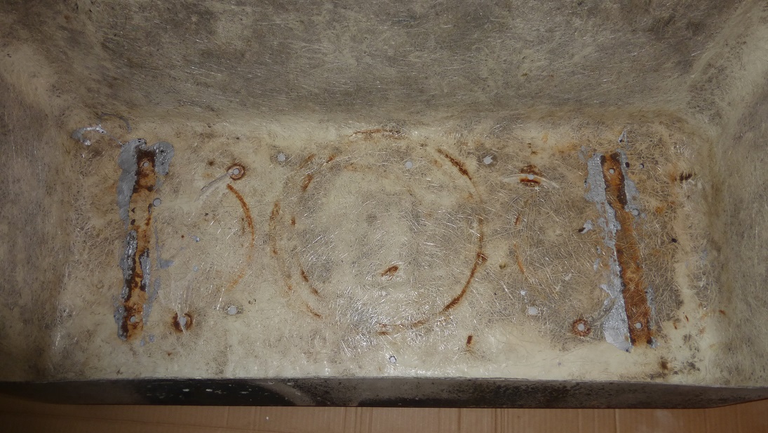 A więc, zacząłem od wzmocnienia dna kufra które było mocno nadgryzione zębem czasu a może nawet bardziej kołnierzami butli orającymi je na przestrzeni lat. Dno było popękane i zaskakująco cienkie jak na tak ważny element. Dołożyłem więc matę zarówno od wewnątrz jak i od spodu.