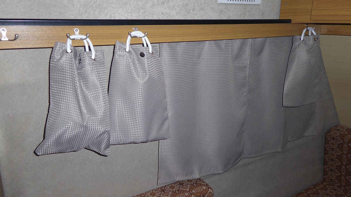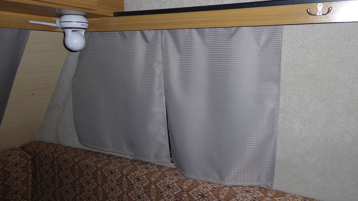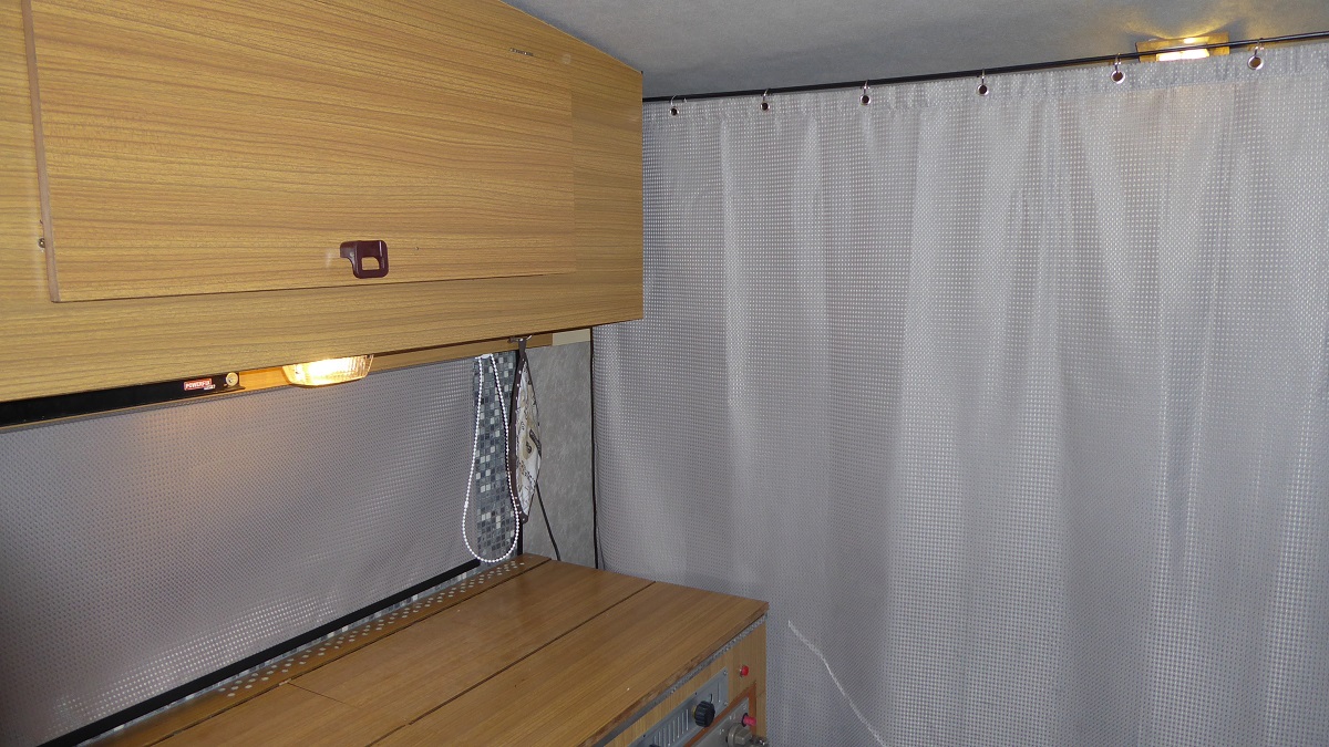 Z tego materiału jest też nowa kotara zasłaniająca kibelek/łóżko. Długością dochodzi do materaca łóżka i więcej nie potrzeba. Od dołu obciąża ją plastikowa tasiemka, żeby lepiej się układała, tak jak to jest w kotarze prysznicowej. A jeździ po lince na kółeczkach od kluczy.