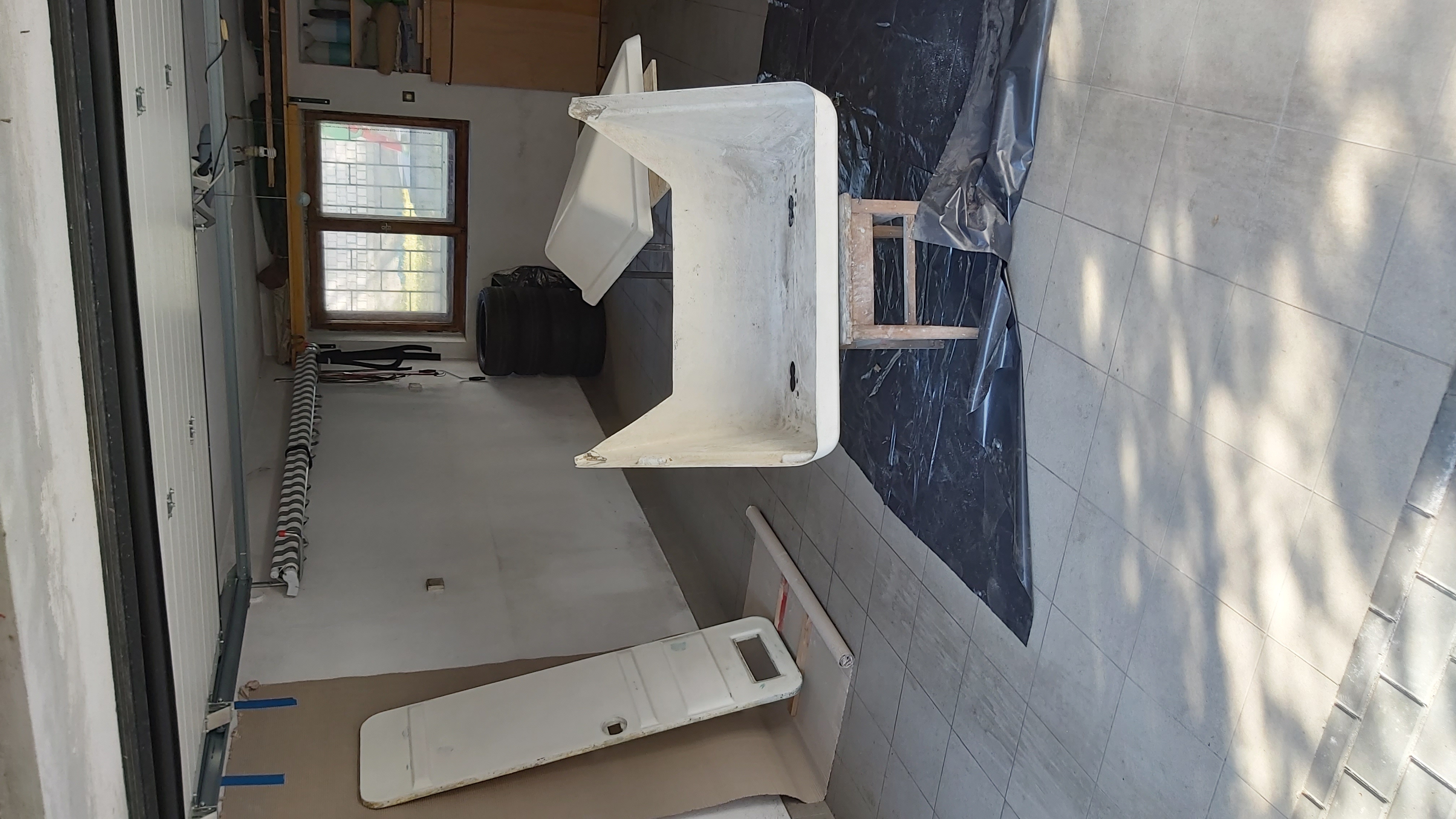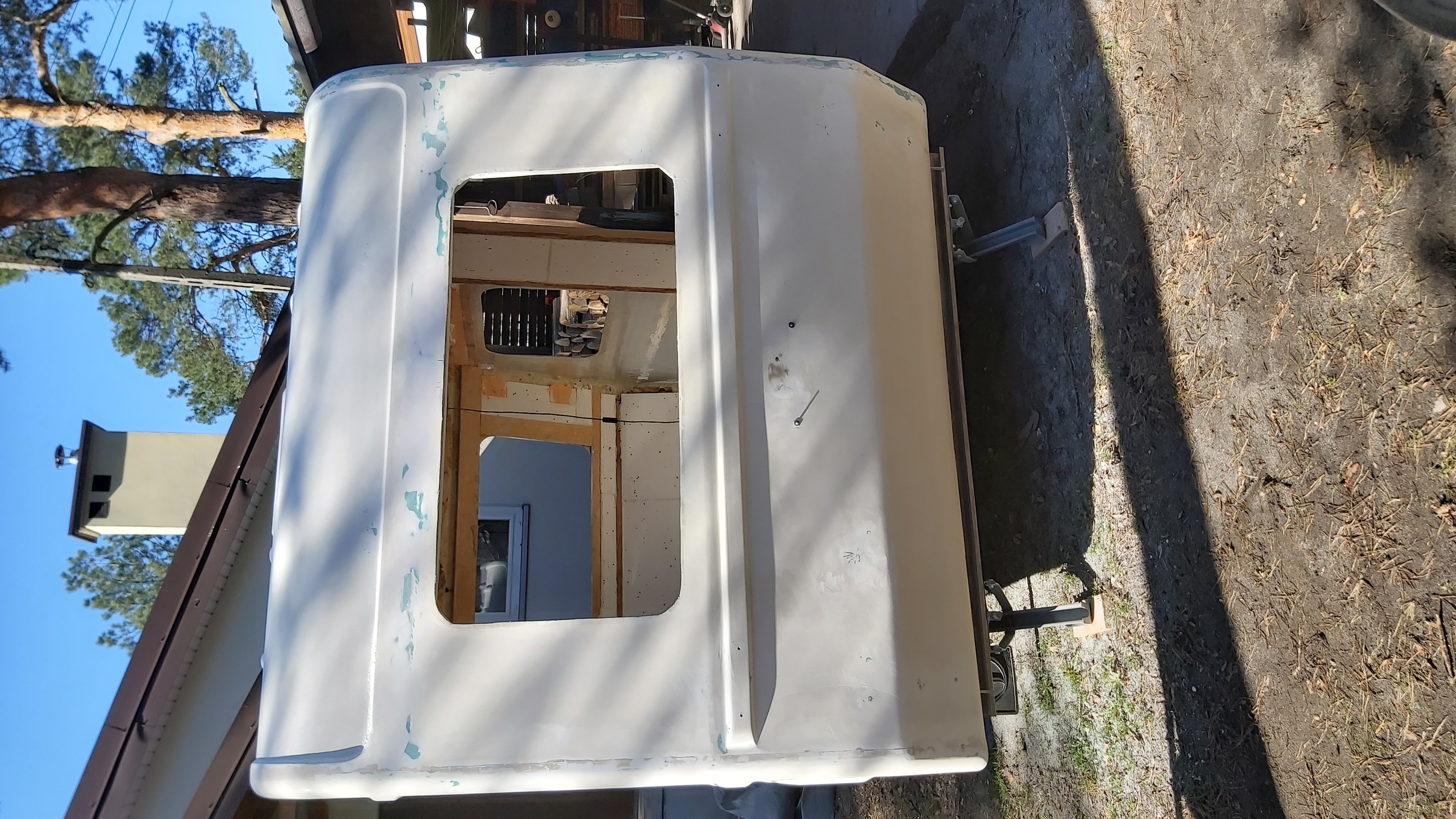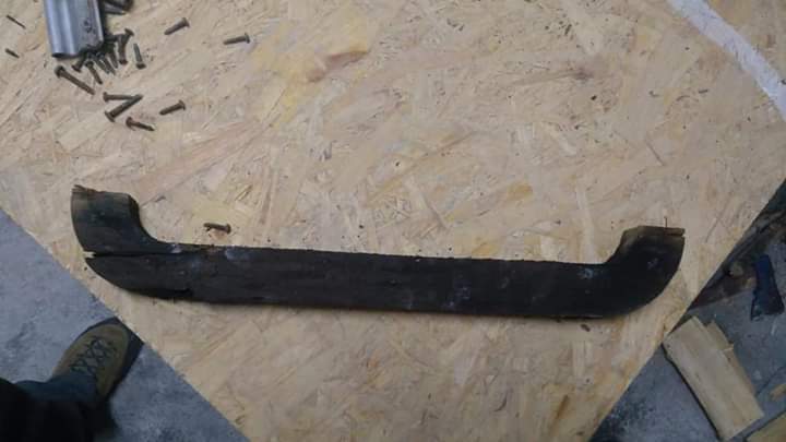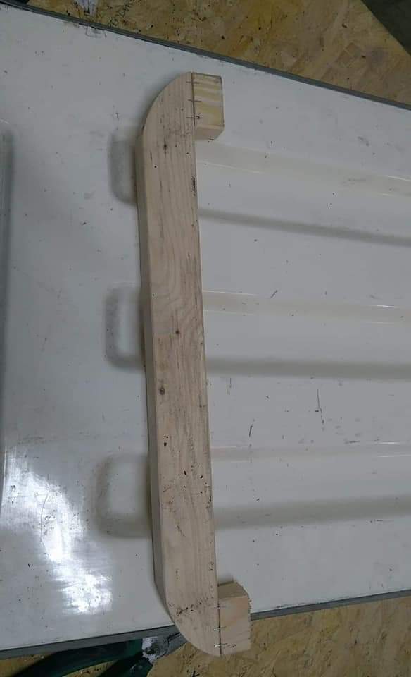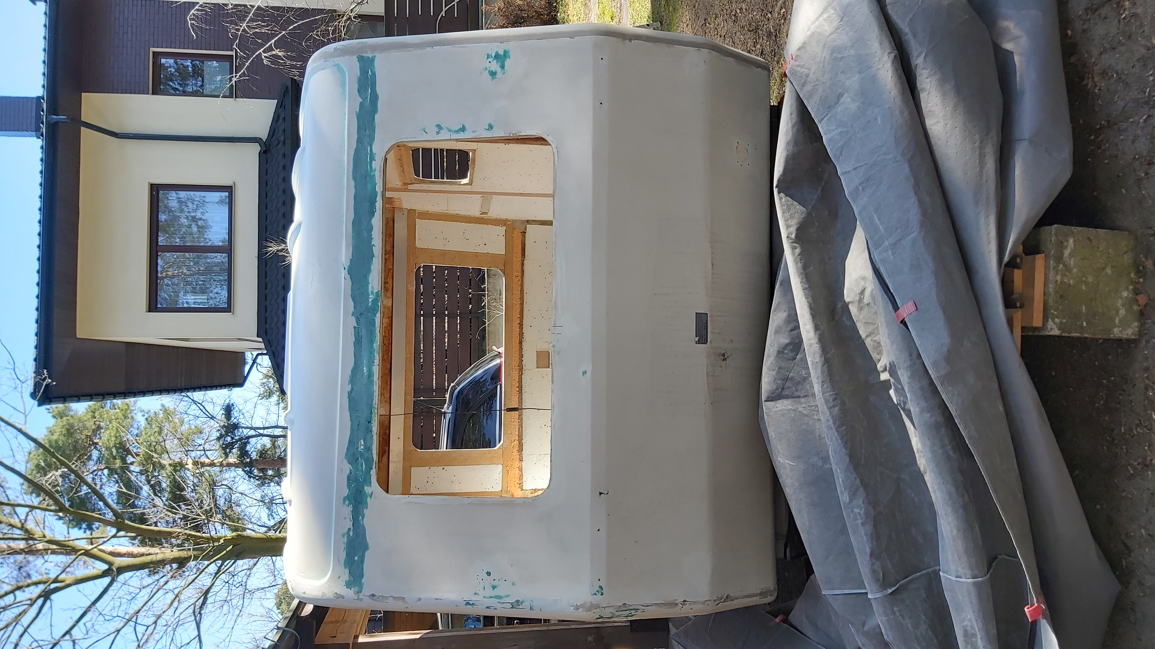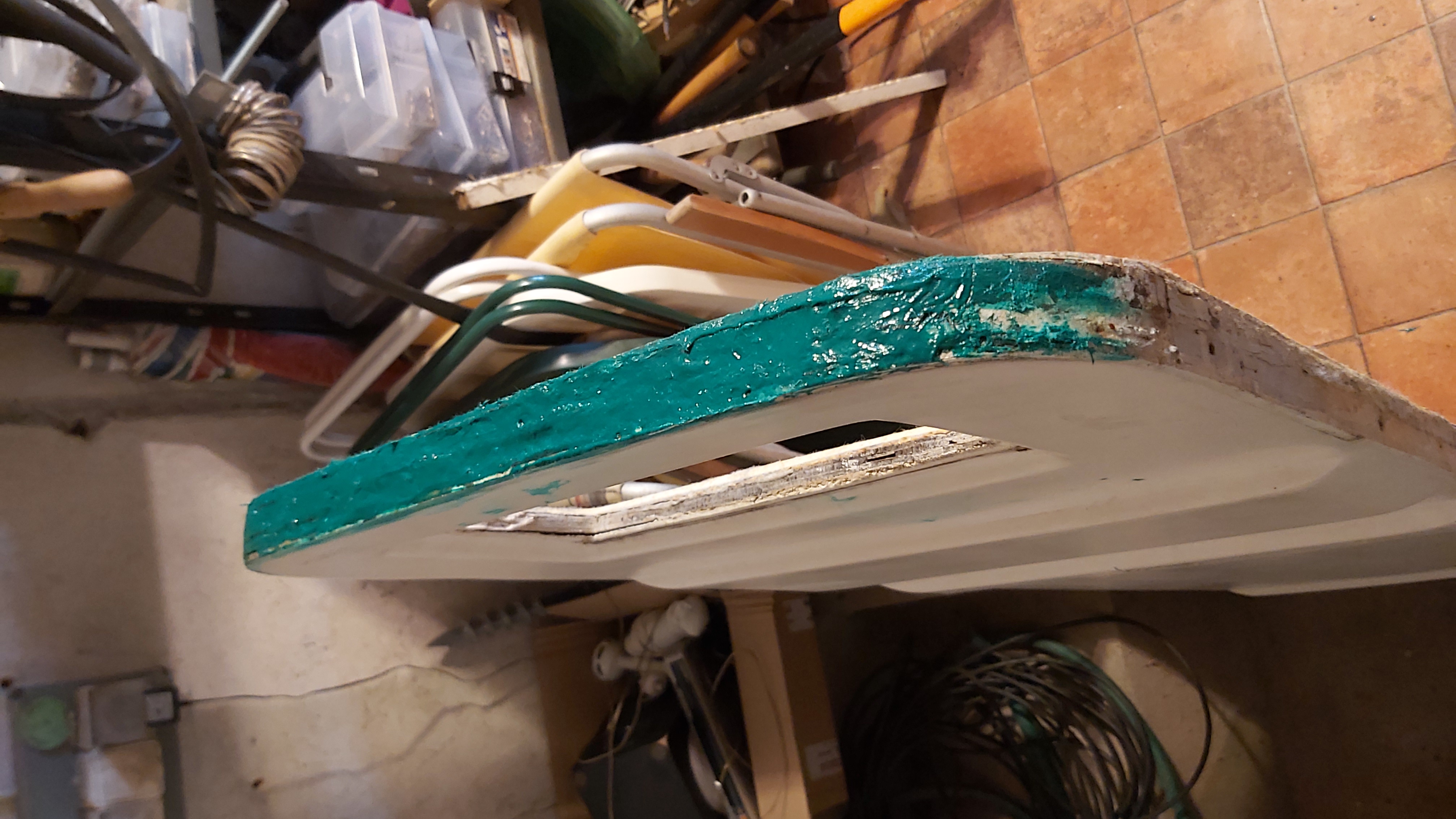 Dolna krawedz drzwi trochę podgnita. Po wysuszeniu, na grubo zalałem ubytki po wykruszonej sklejce żywicą. Na to szpachla z włóknem i drzwi uratowane