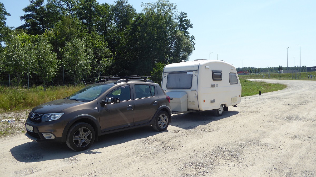 Przyczepa elegancko i równiutko stoi za autem, nieco wyżej niż stała na poprzedniej osi. Dla przypomnienia, opony to 165R13 czyli pełny profil. W chwili robienia zdjęcia ciśnienie 3,0 bara a na pokładzie jest niemal wszystko, łącznie z 3/4 pełną 11-ką. Do naszego pełnego wyposażenia wyjazdowego brakuje jedynie dobrze znanych wszystkim krzeseł i stołu, żarcia w lodówce oraz... tronu