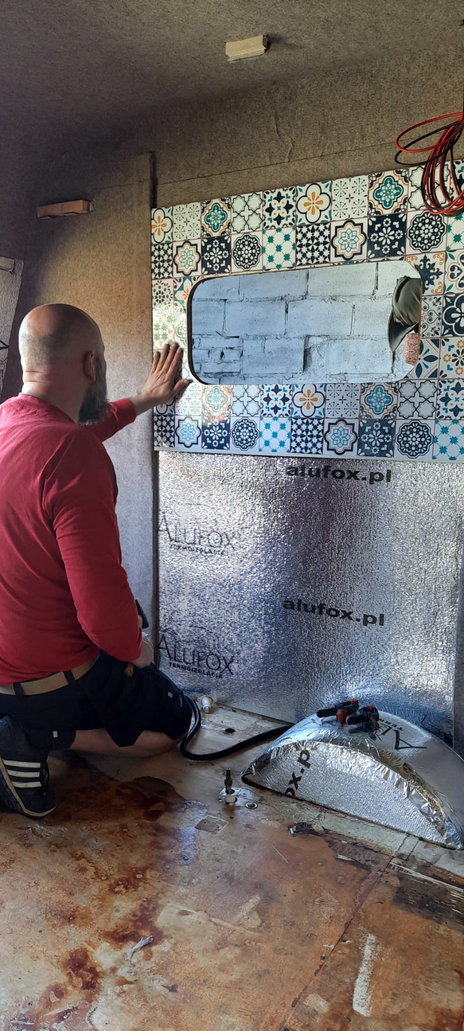 Dzień spędzony na zaklejaniu łączeń izolacji i przyklejaniu największego płata tapicerki. Tym razem bez pędzla