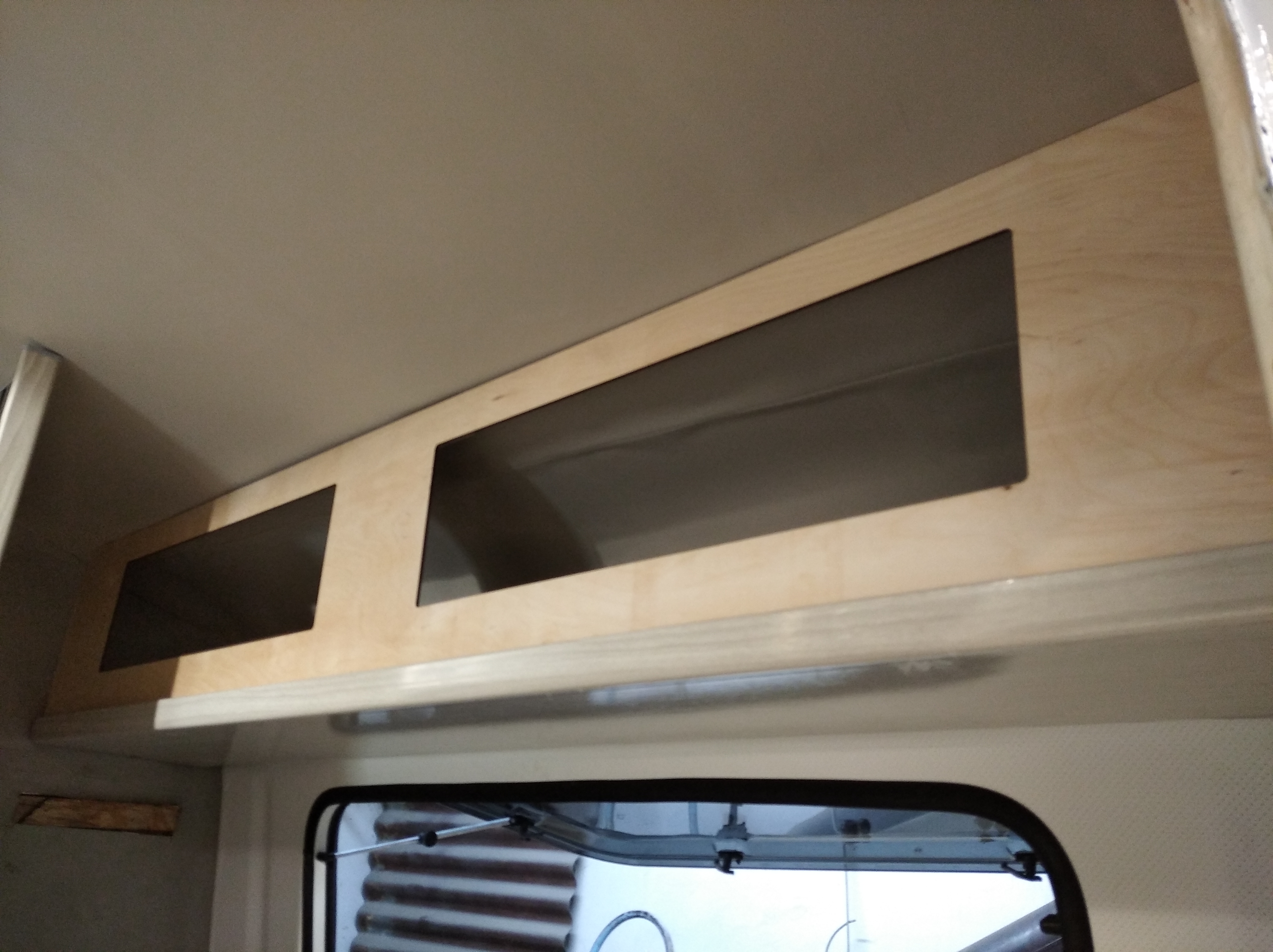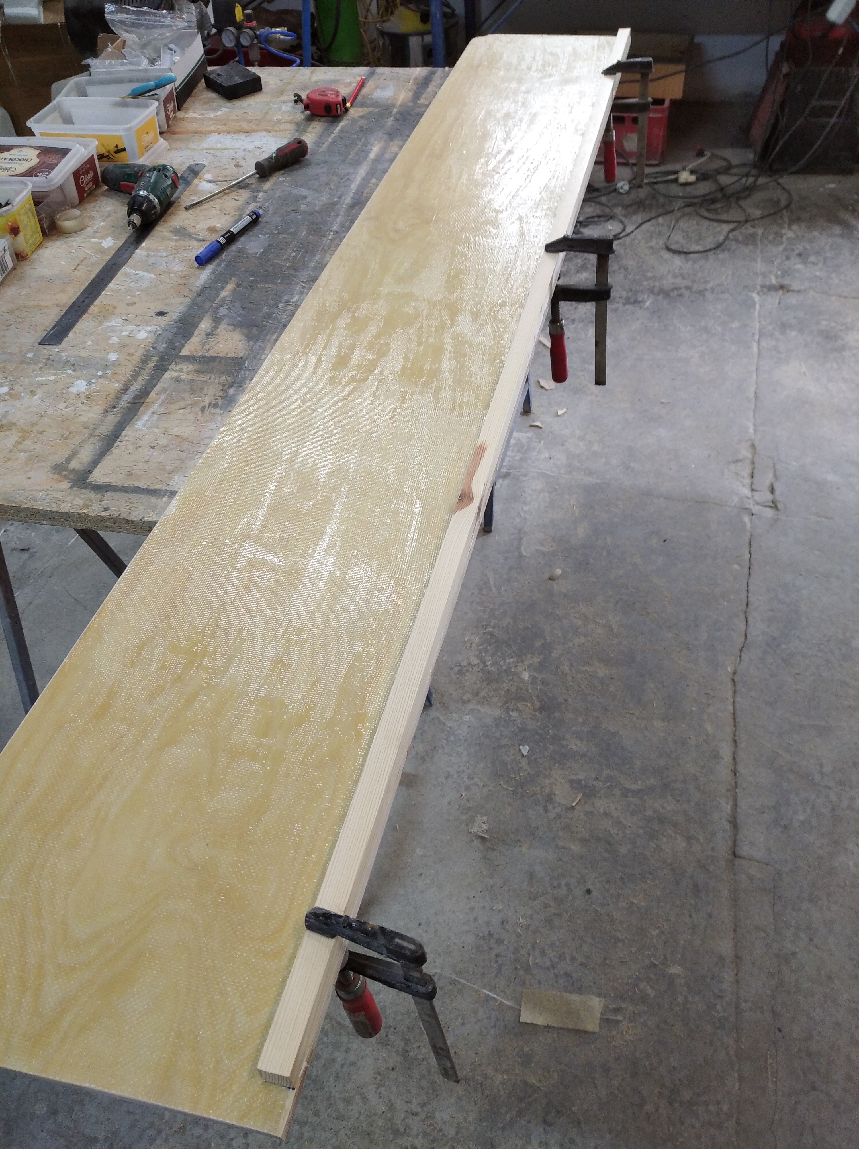 Łóżko górne wyschło i jest już oczyszczone z ostrych krawędzi maty szklanej. Fajnie się wzmocniło jednak dla pewności zastosuję 4 listewki po długości. Pomoże to także w zamocowaniu listwy zawiasowej pomiędzy dwoma płytami pionowo, przykręcając do czoła płyt a nie "na płasko".