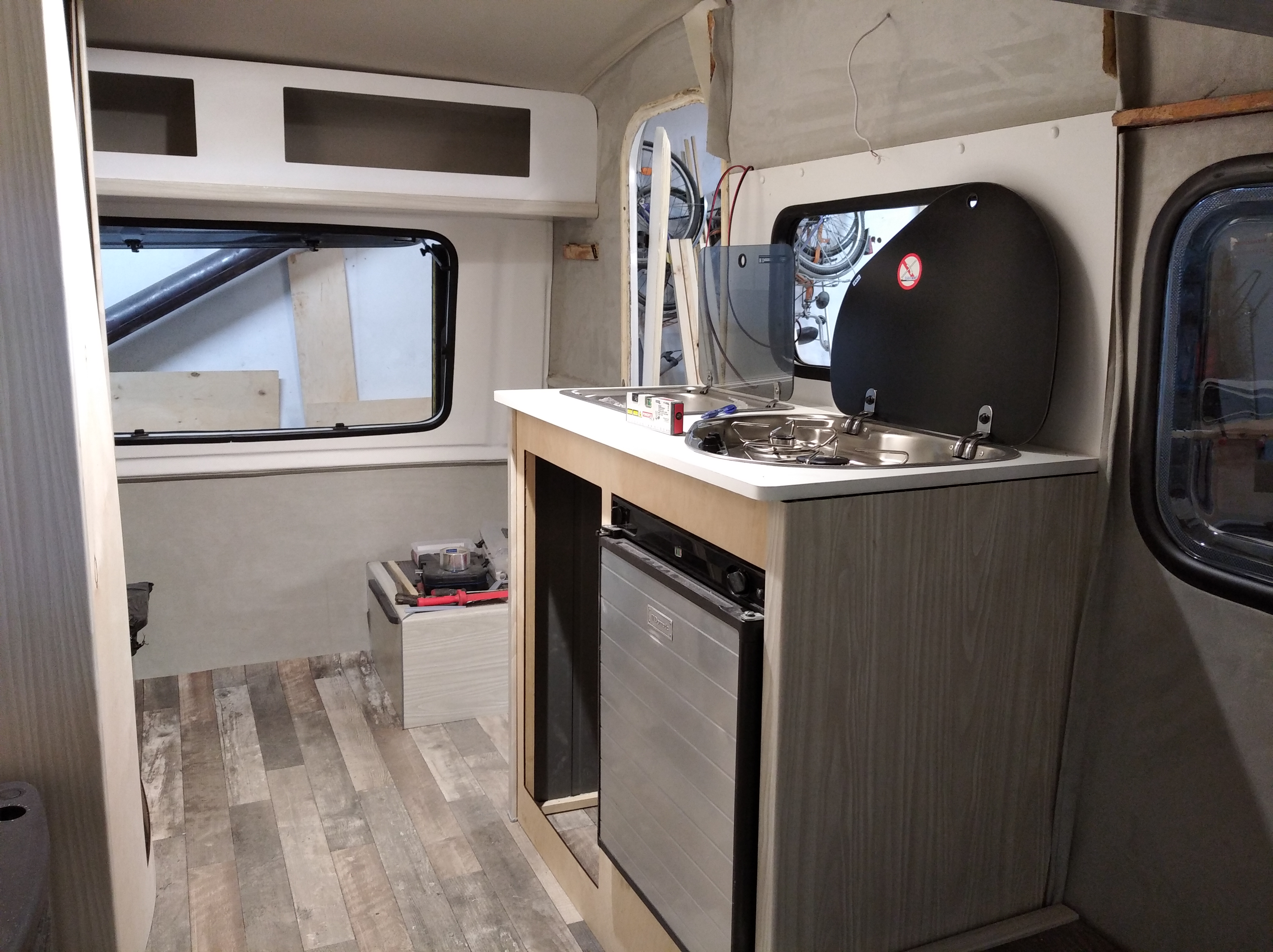 Wyciąłem też w dostarczonym blacie kuchennym otwory i osadziłem wstępnie zlew i kuchenkę.