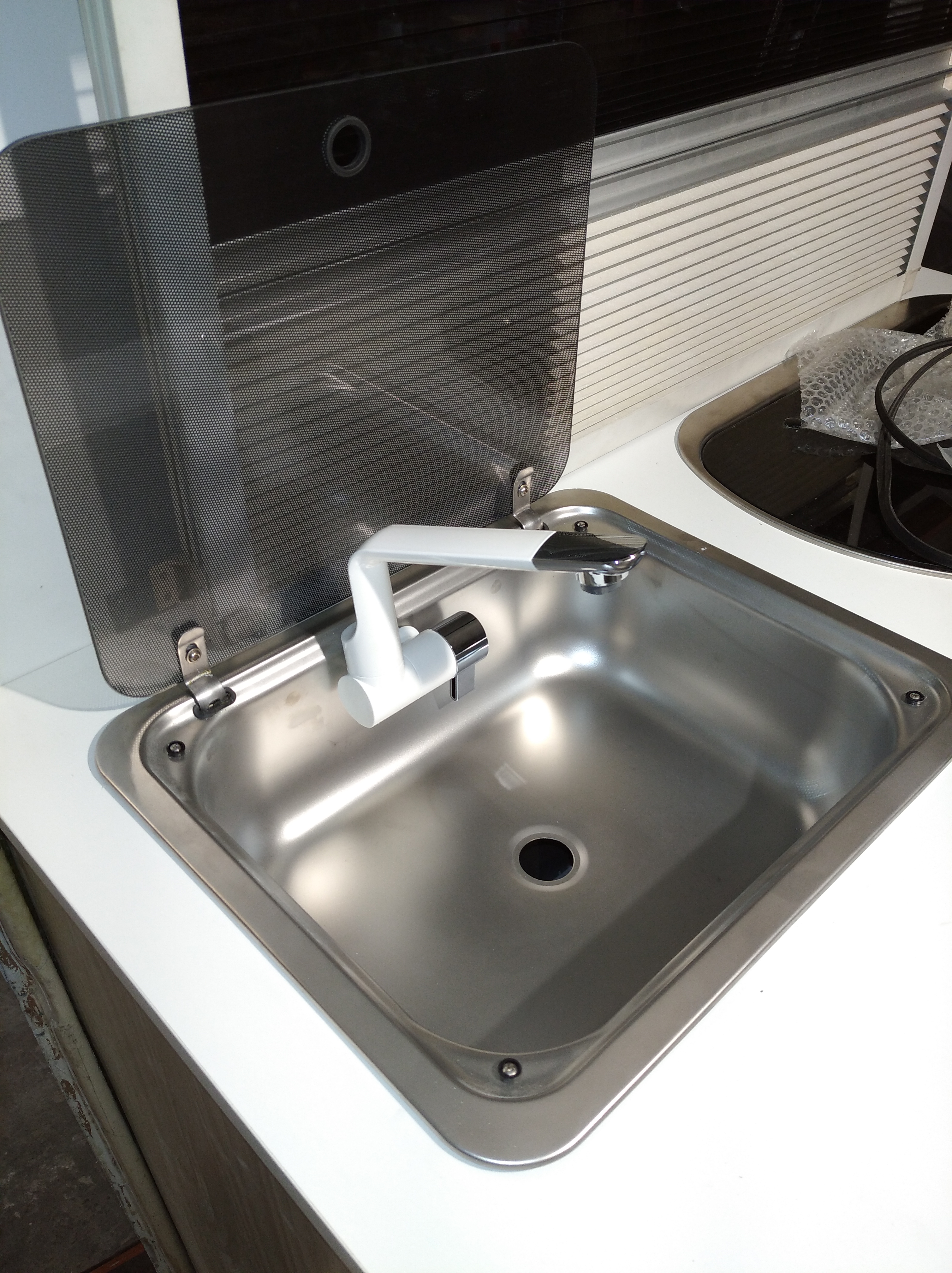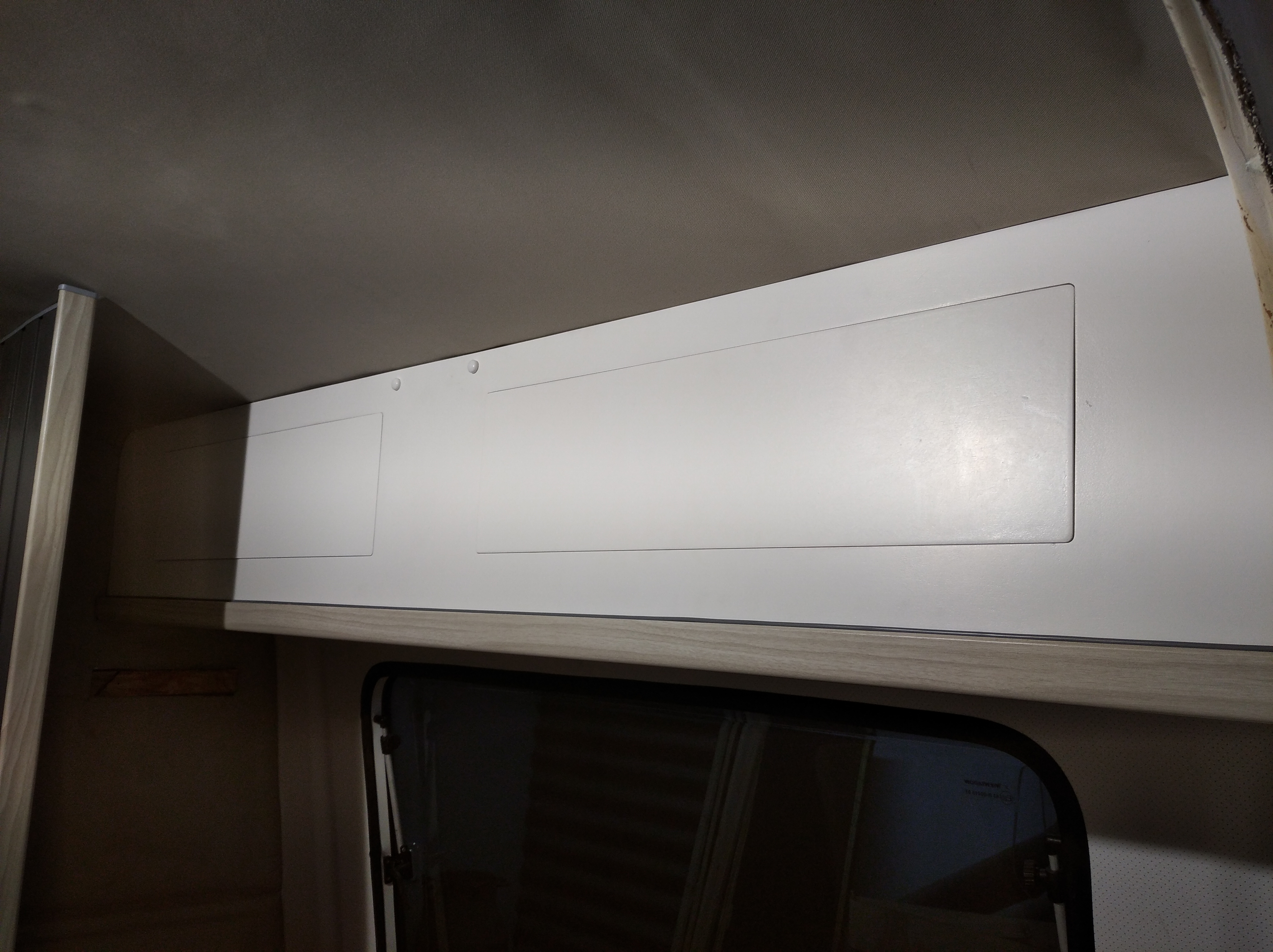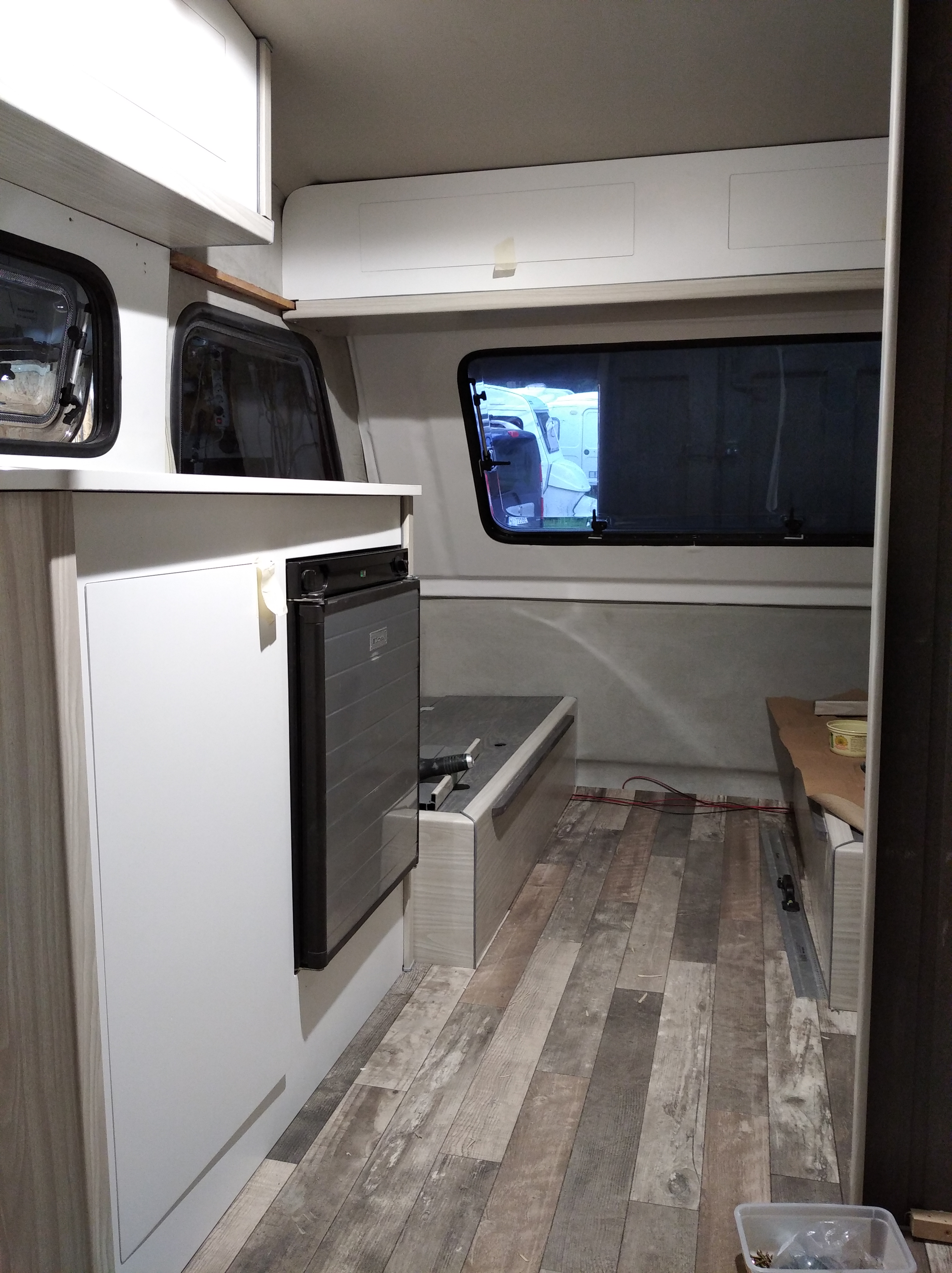 Zakończone meblowanie i przyczepa nabrała fajnej jasnej aury w środku. Białe meble z bokami w okleinie dąb skandynawski robią robotę