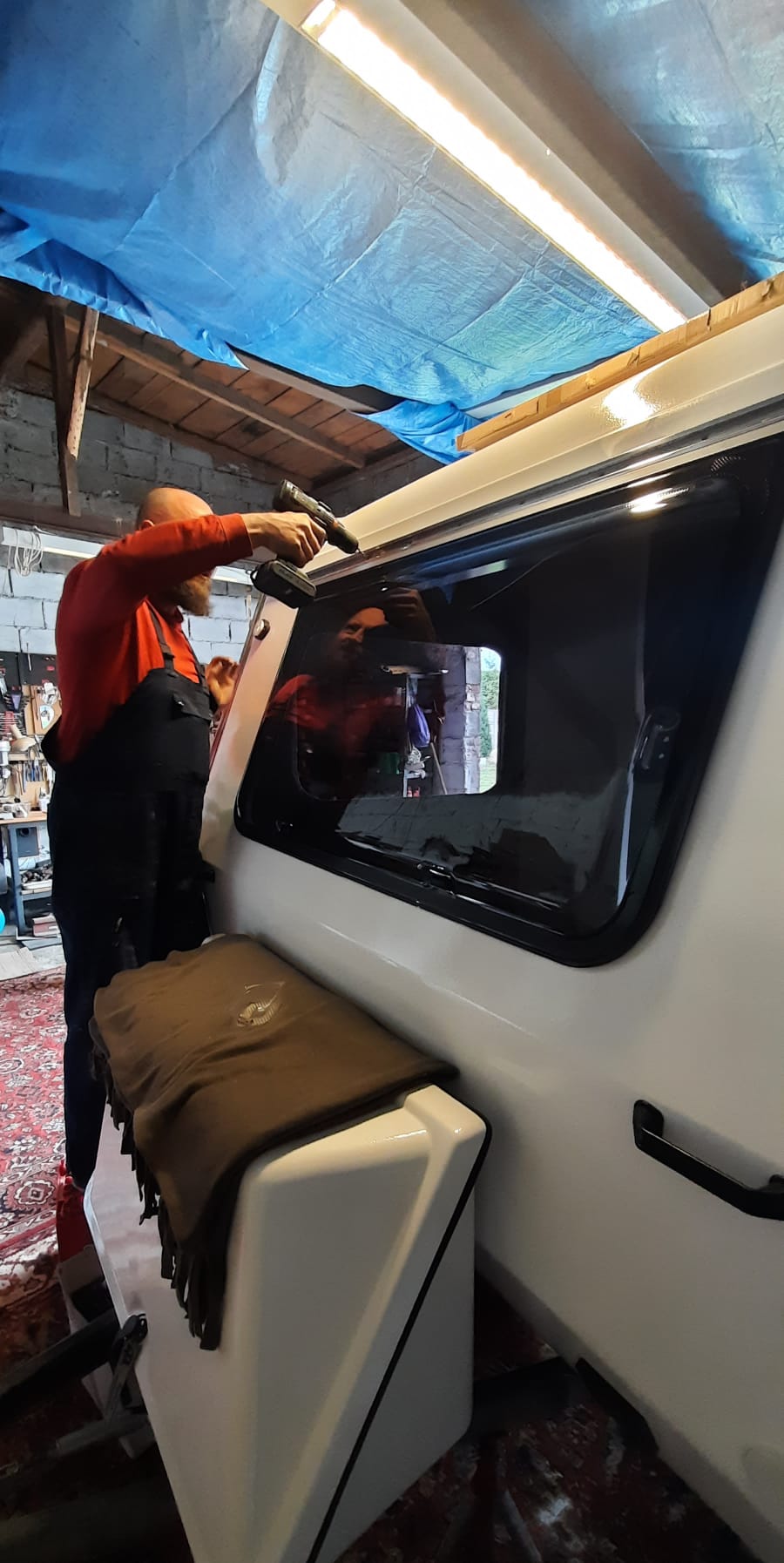 Ścianki przedłużone, wkleiłem deski 16mm, lodówka jednak będzie nad kołem, nie wiem jeszcze jak ją zakotwiczyć żeby nie latała. Musialem odciąć ori rurkę gazową pod podłogą. Przymiarka szafy i piecyka. Lekko sfrezowalem krawędzie na wysokości obudowy. Siedzi idealnie. Czy jest jakiś szablon Trumy do wycięcia otworu w podłodze? Z przyjemniejszych rzeczy zamontowaliśmy okno przednie i poleżeliśmy na przyczepowym materacu