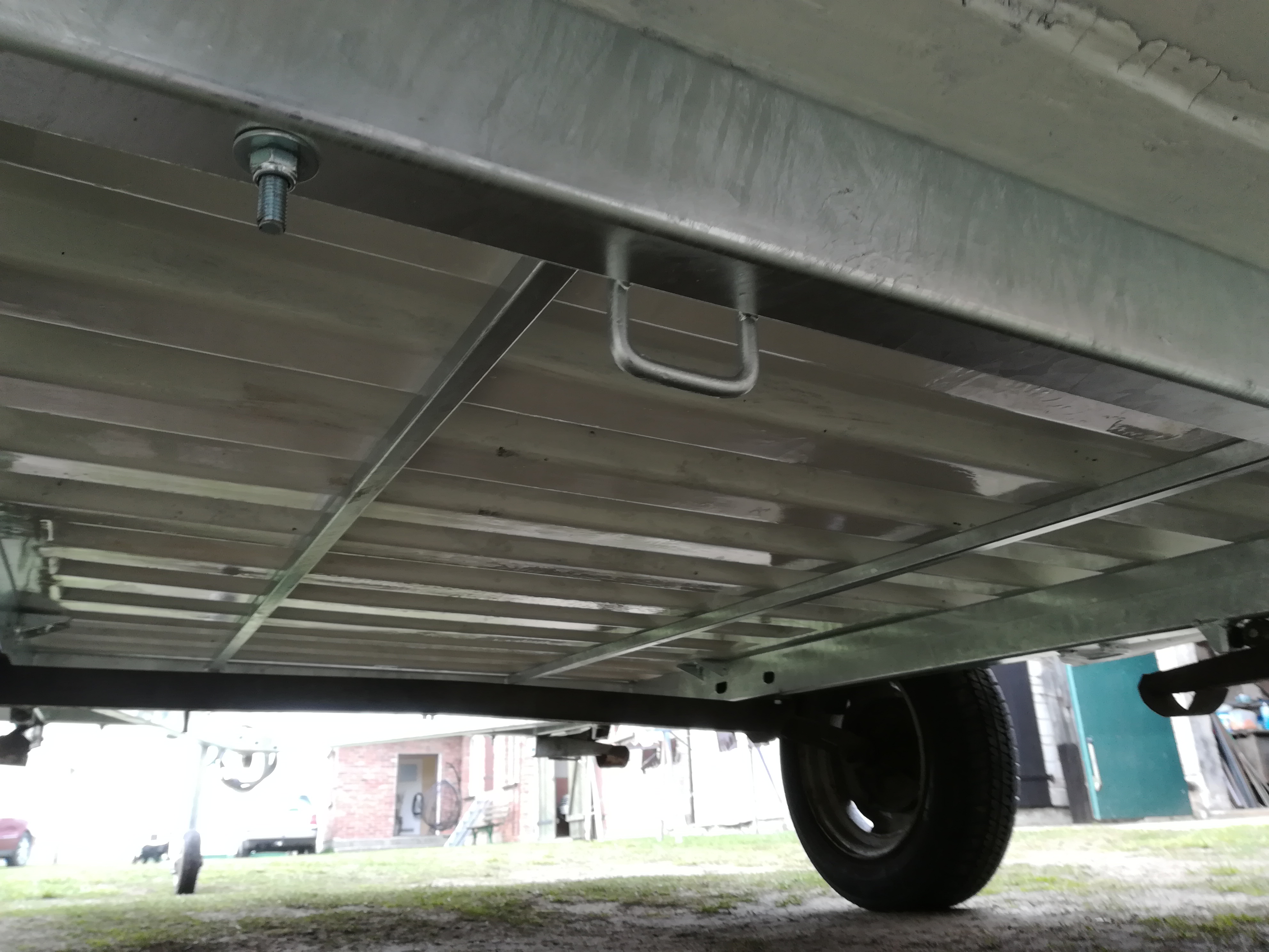 Rama super! Teraz już po ptokach ale co bym zrobił inaczej to dołożyłbym poprzeczny kątownik w połowie długości ramy (prócz tych dwóch wzdłużnych) zapobiegający zapadaniu się podłogi i wymieniłbym podpory na te nowszego typu otwierane we "właściwą" stronę. Te stare to niestety męka, jeśli przyjdzie konkretniej poziomować przyczepę. Znam ten ból. Widzę też jakiś stary zaczep, moim zdaniem out bo tu też nie ma żartów.