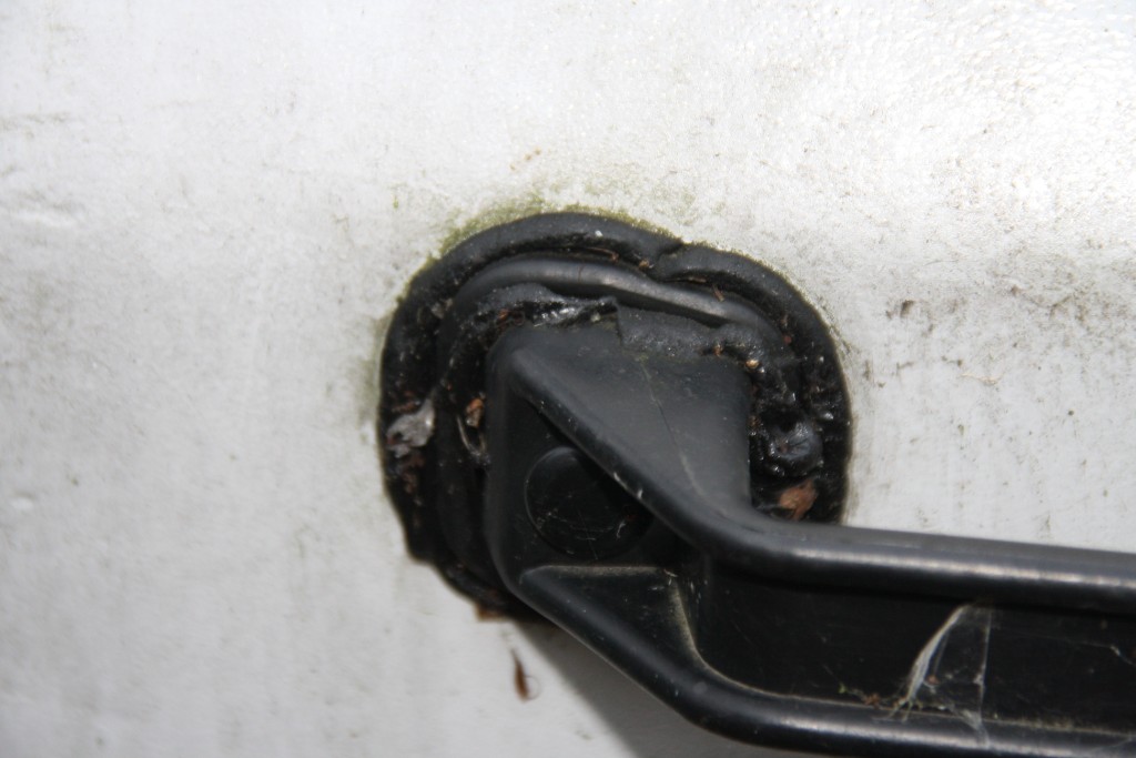 Poniżej fota nowych uchwytów manewrowych które zamontowałem w zeszłym roku. Butyl (jako że właśnie ma konsystencję plasteliny) "wypłynął" spod stopek uchwytów, gdy te zostały dociśnięte do laminatu. W przypadku czarnych uchwytów to jeszcze jakoś ujdzie, ale gdyby były białe?